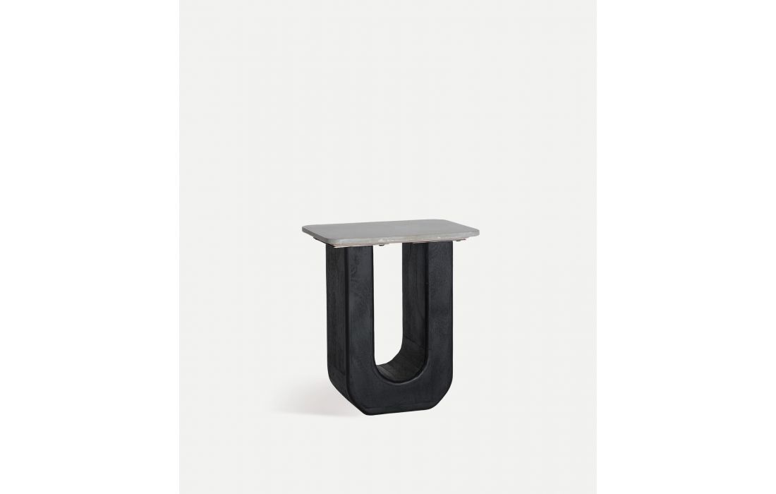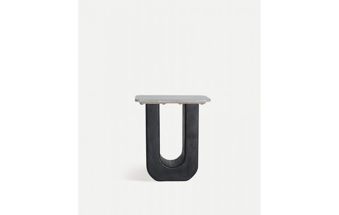 The KHEJ side table blends contemporary design and natural materials.Its U-shaped mango wood base is combined with a marble envelope that provides sophistication. Dimensions in cm