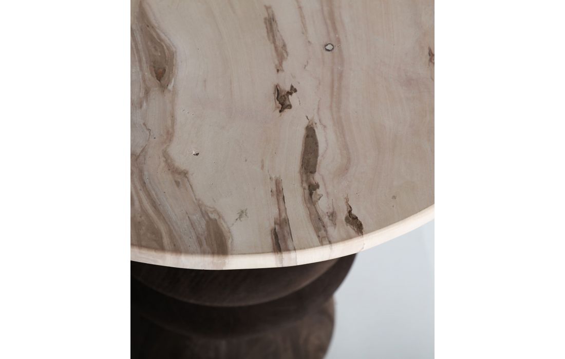 The VRADS side table, in mango wood, is a versatile and sophisticated piece that stands out for its solid wood sculpted base and delicate natural stone envelope.