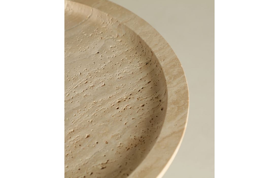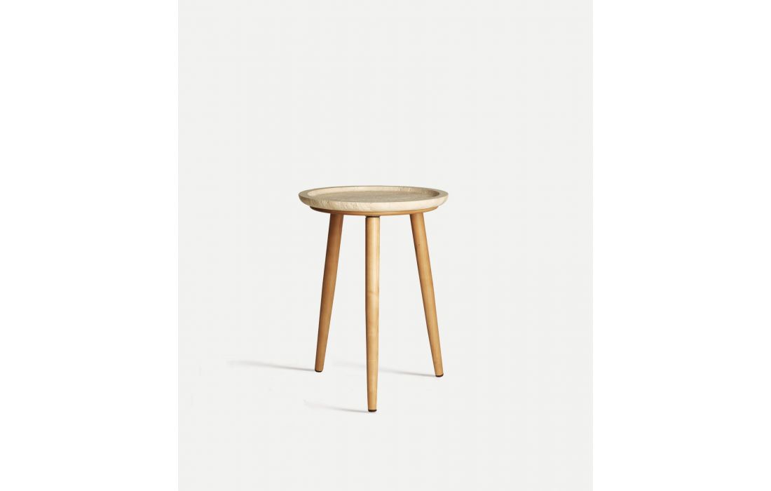 VIDEIX side table in marble with a birch base, ideal for adding a touch of modern elegance to any space. Its round and compact design, supported by three slender legs, gives it stability and a sophisticated style.