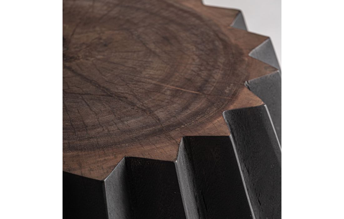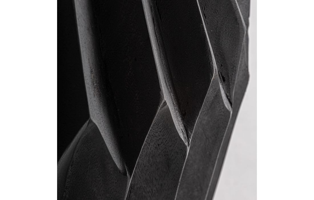 This table stands out for its sculptural character and powerful formal presence. Made of suar wood, its faceted volume creates an interesting play of light and shadow that brings depth and dynamism to the space.