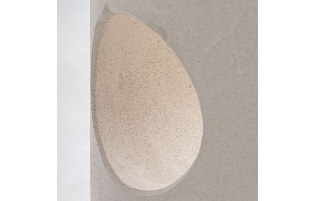This side table combines contemporary design and the expression of materials. Made of broken white terrazzo, its cylindrical shape with a side opening brings personality and visual lightness.