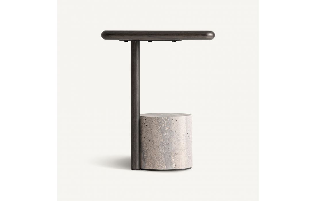 A contemporary style side table that combines the natural elegance of gray travertine with the sophistication of brown ash wood. The travertine top stands out for its unique textures and refined finish, while the wooden structure provides stability and a welcoming touch.