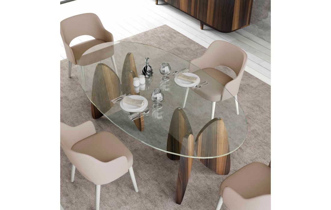 Fixed dining table made of mdf and wood sheet with top made of glass.Recipient :