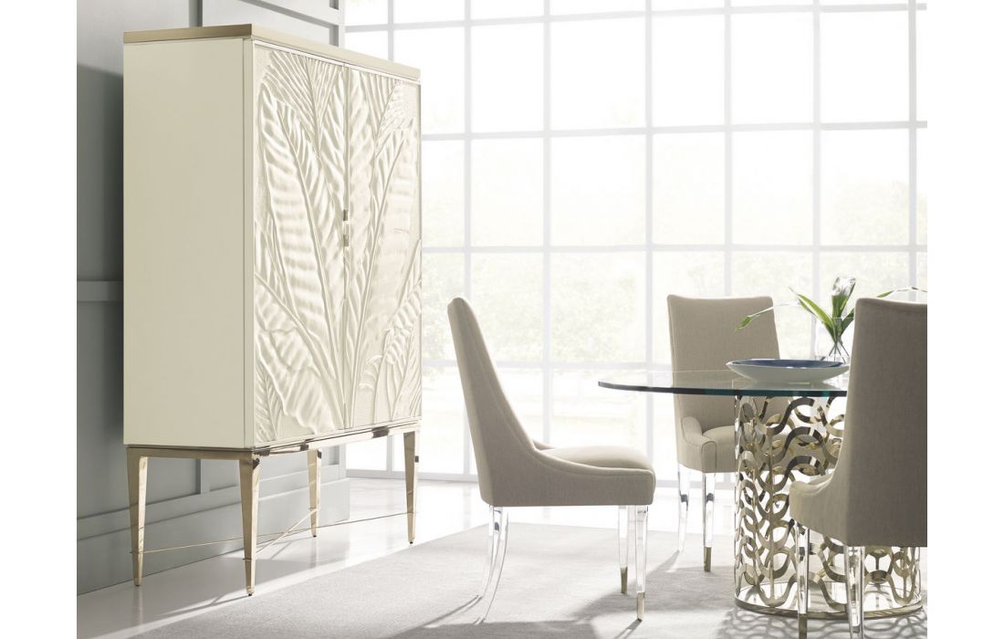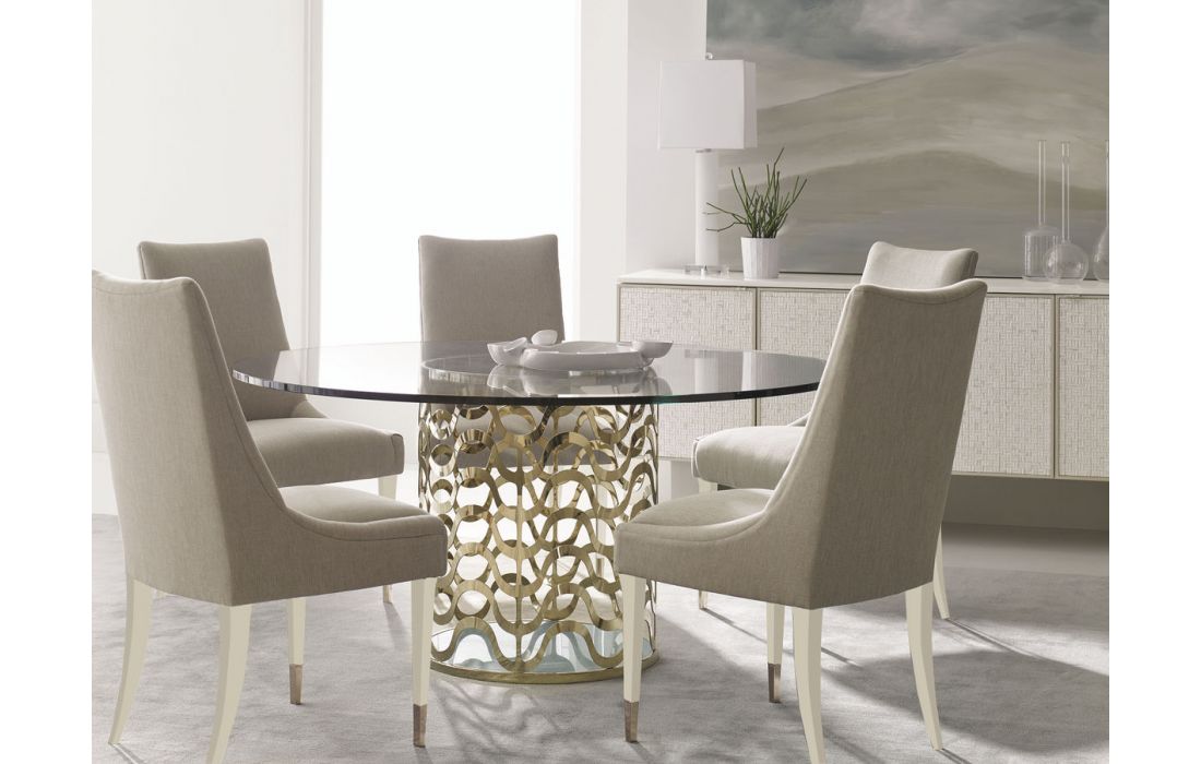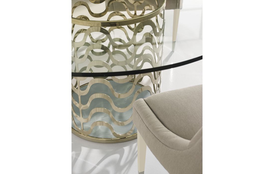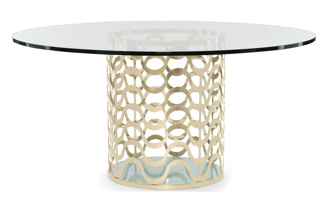 Dining table with glass top, frame in gold metal and with glass detail at the base
