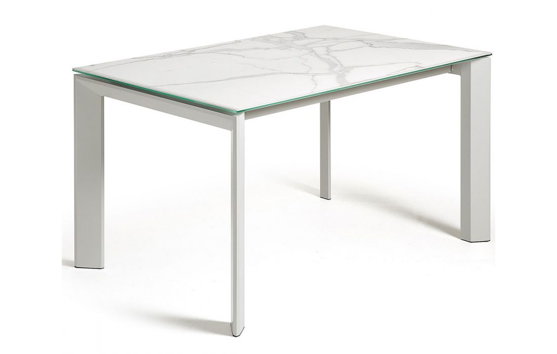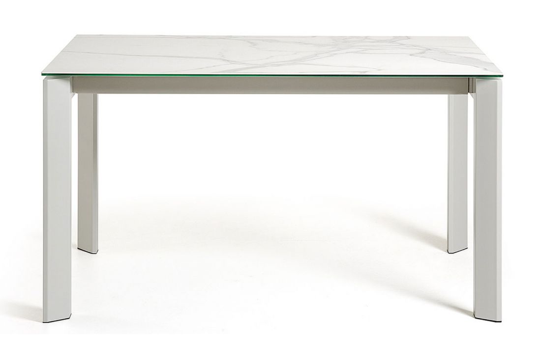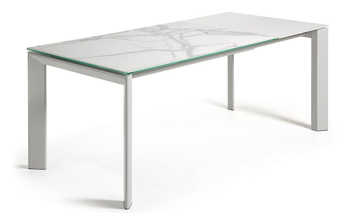 Extendable table with steel frame, painted epoxy-topped procelana perched on glass.