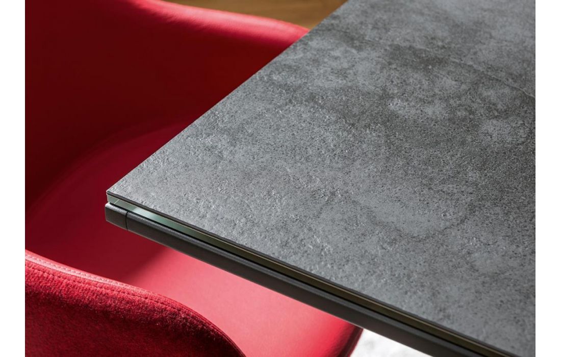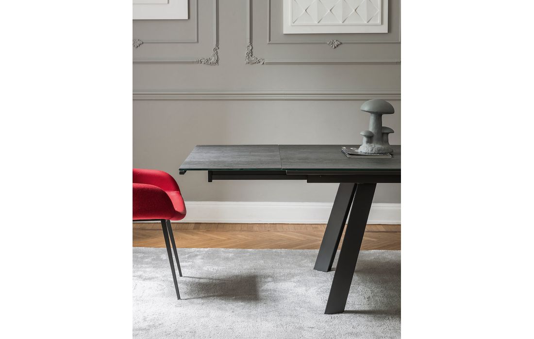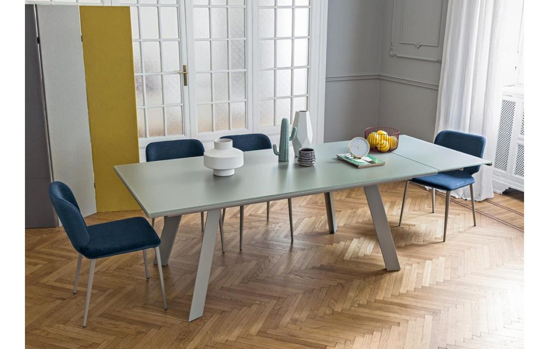 Extendable dining table with four-legged base, legs and structure in lacquered metal. Top in anti-scratch glass or ceramic.
