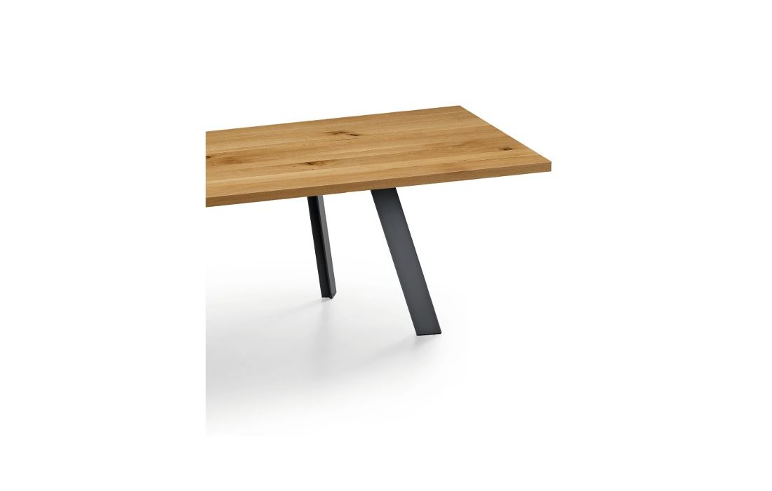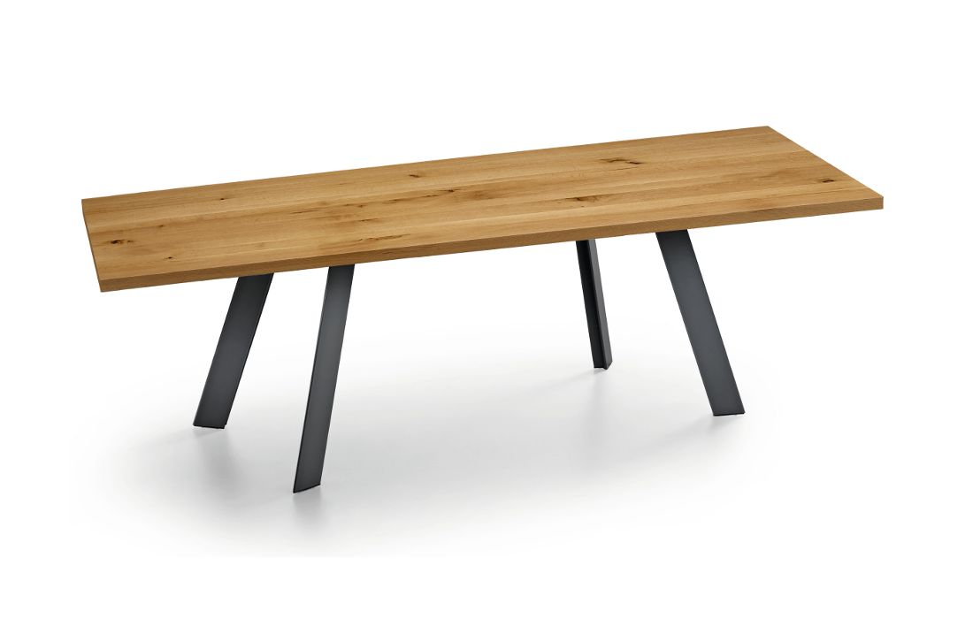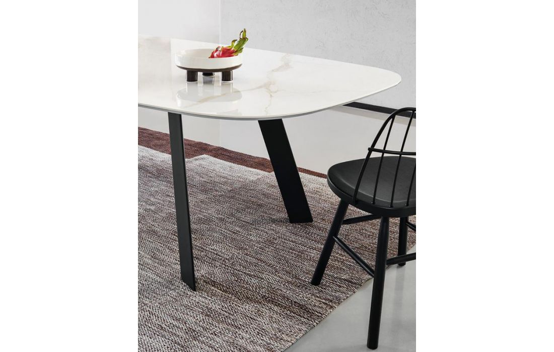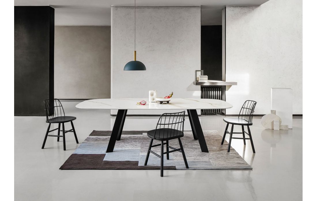 Dining table with four-legged base, legs and structure in lacquered metal. Top in wood or ceramic.