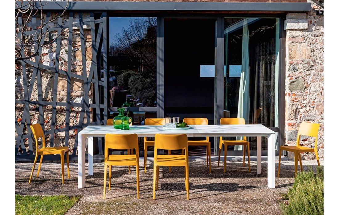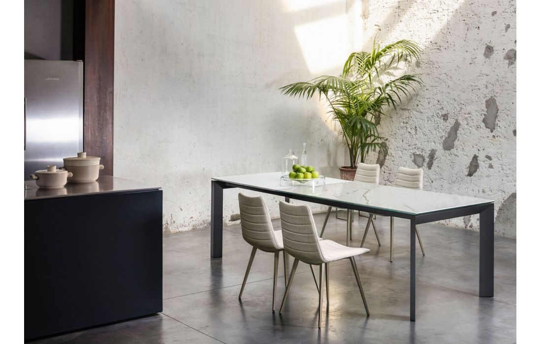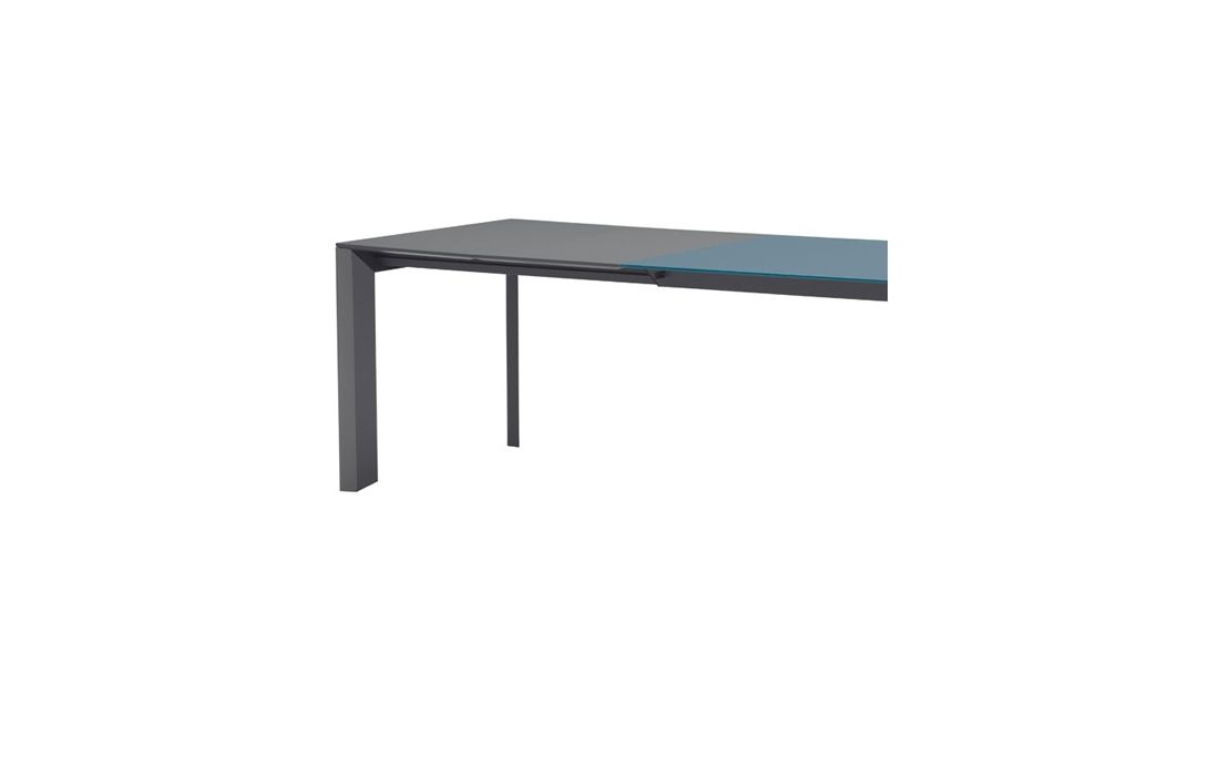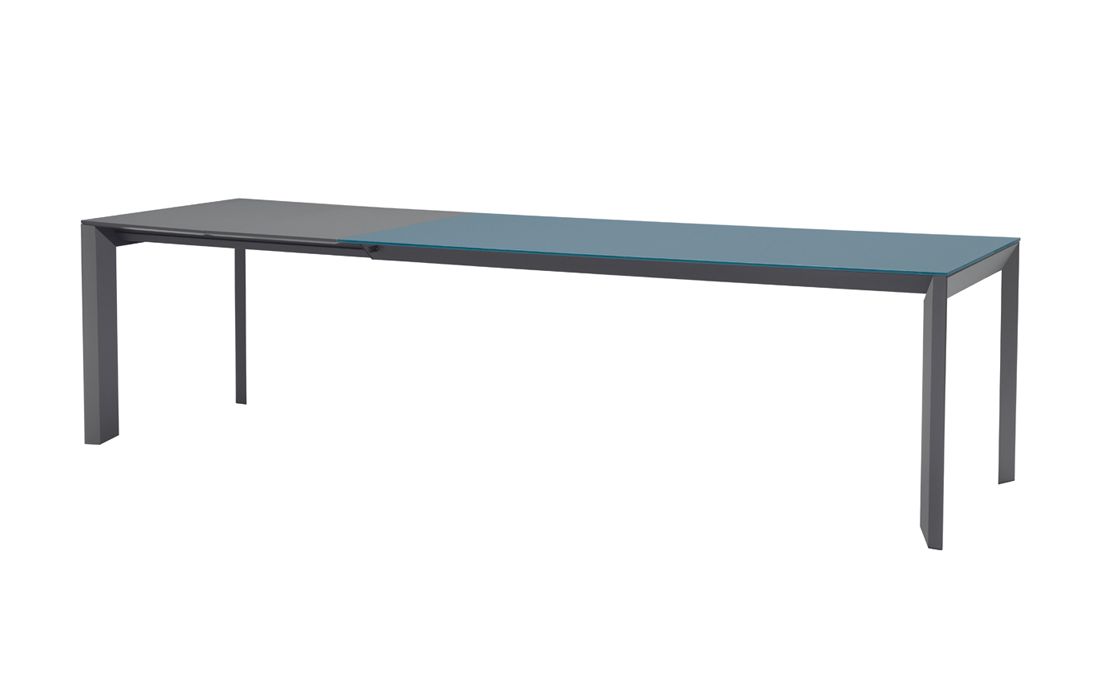 Extendable dining table with a sliding base in painted steel. Top in glass or ceramic.