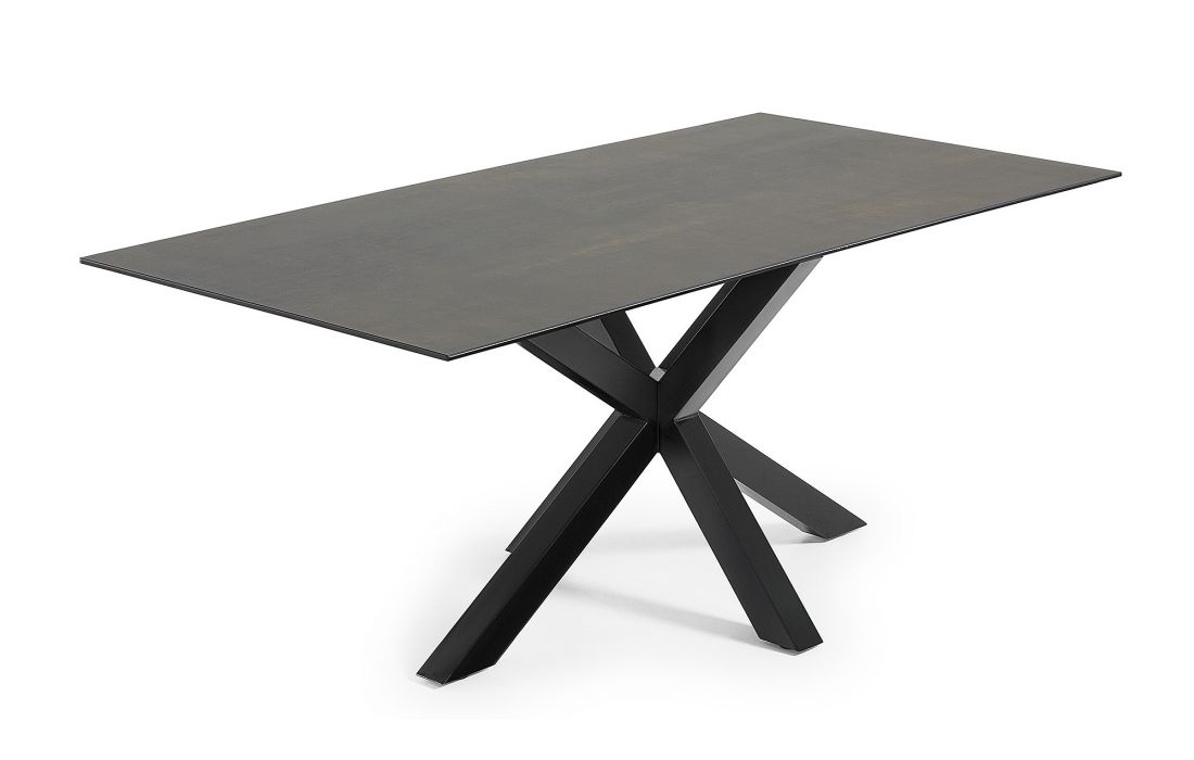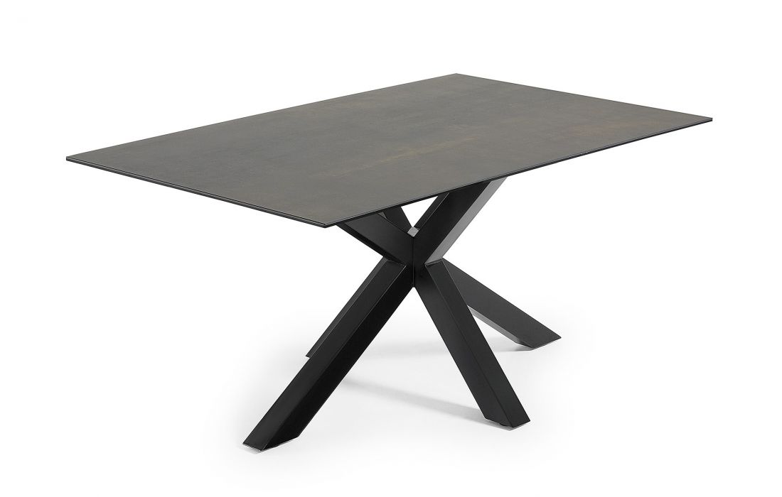 Table with feet in black colored steel, topped porcelain iron moss perched on glass.