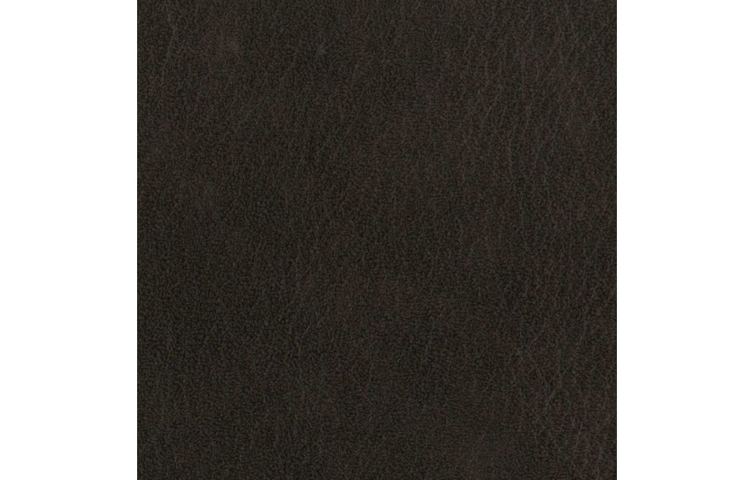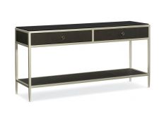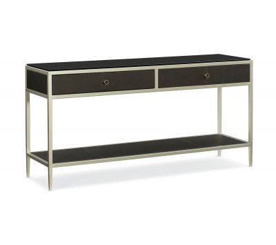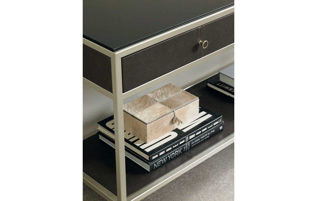 Metal console with dark glass top, two gray leather drawers and a shelf also sheathed in leather.