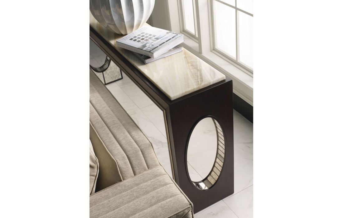 Console with marble top and veneer structure with glass interior.