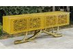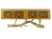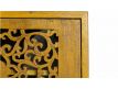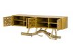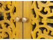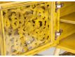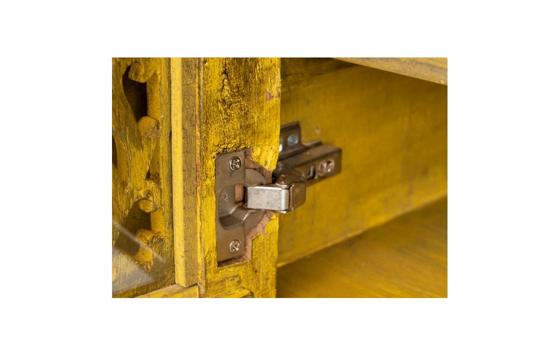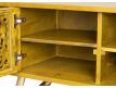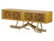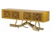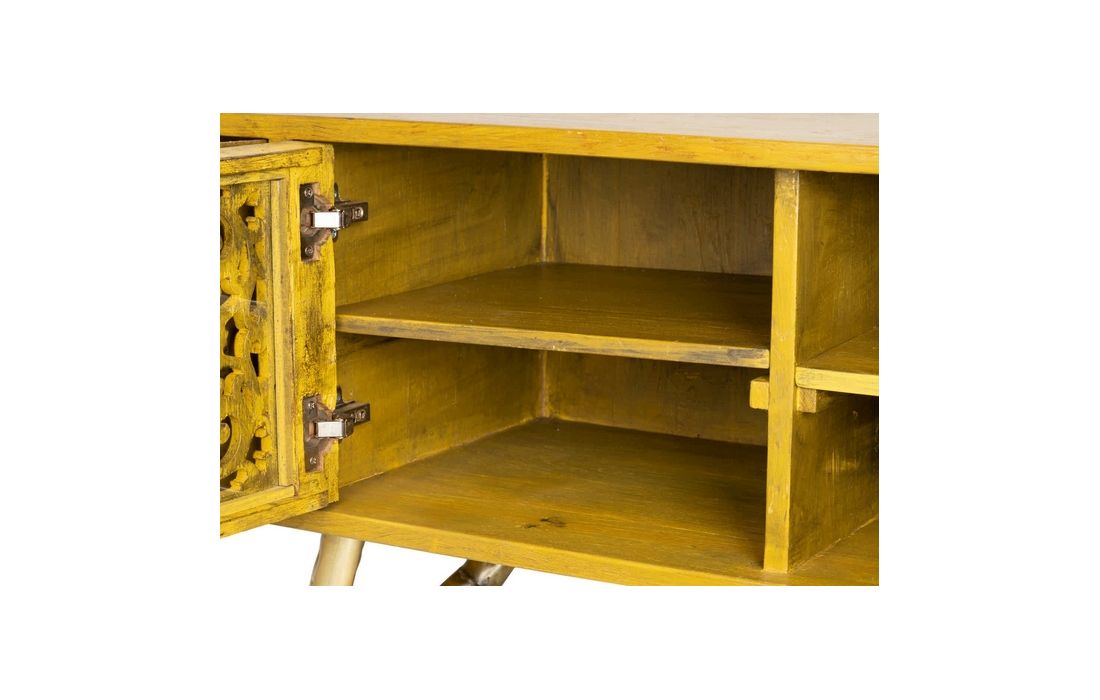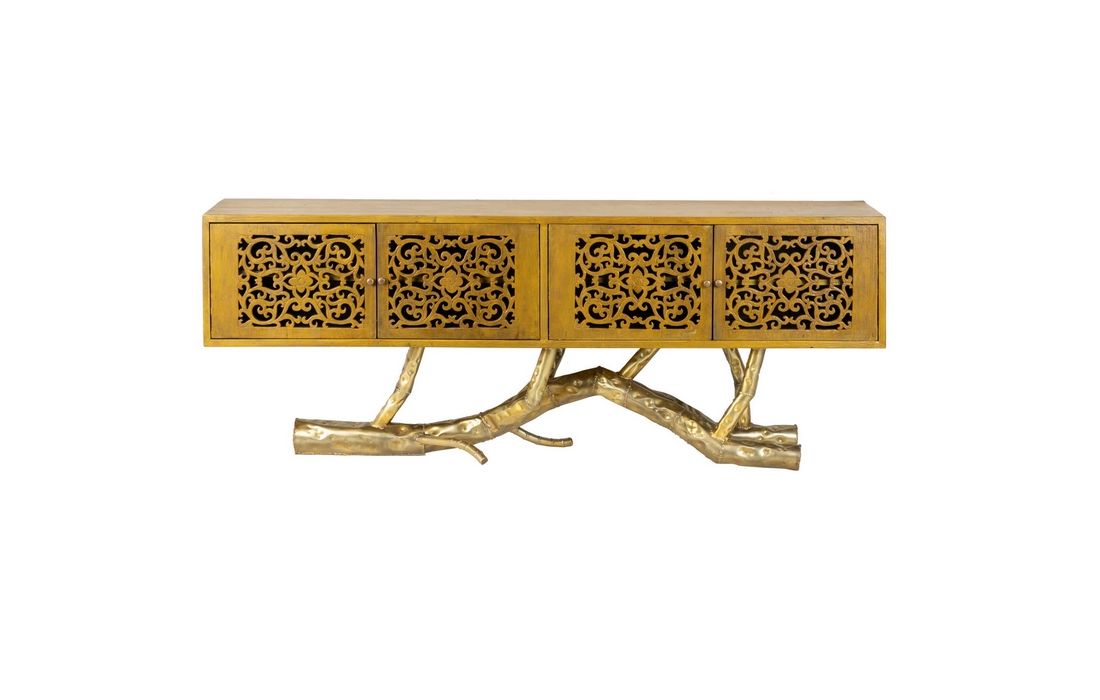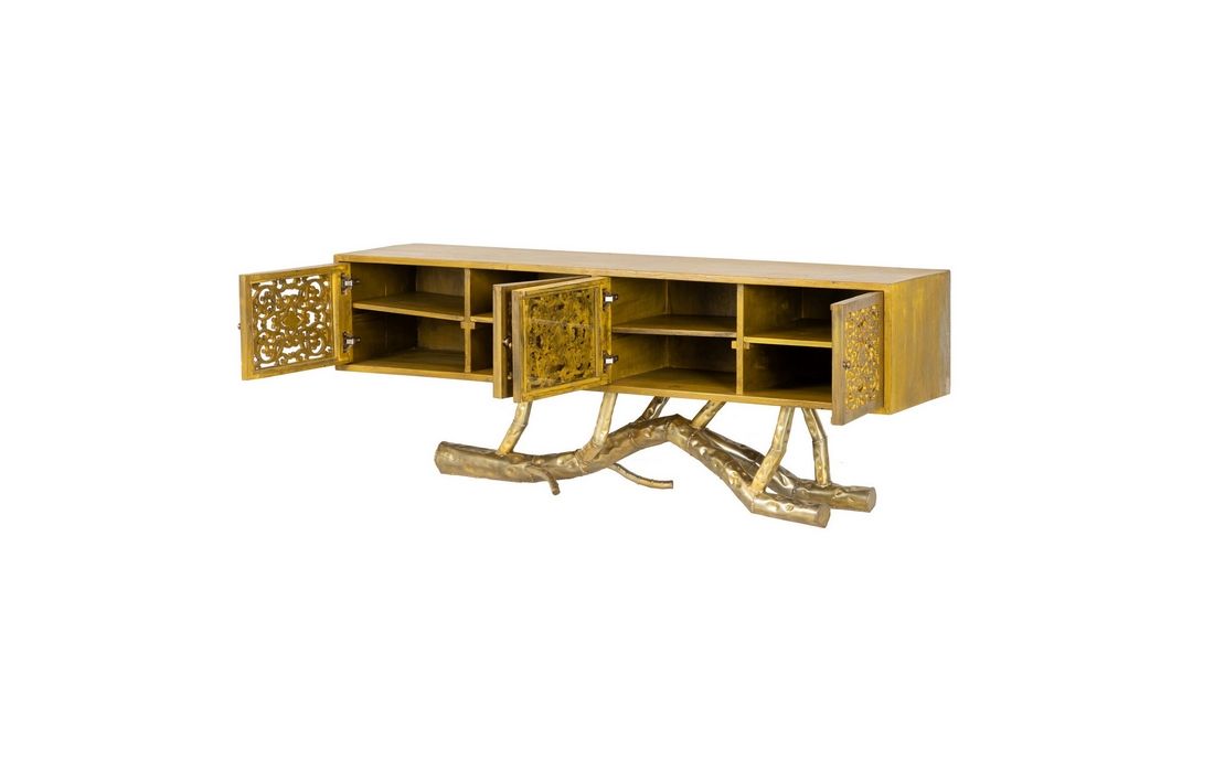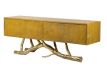 Console in yellow recycled teak wood with 4 doors and feet in golden brass