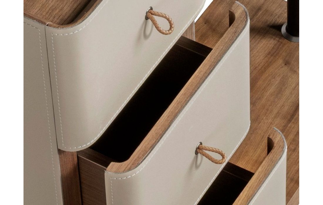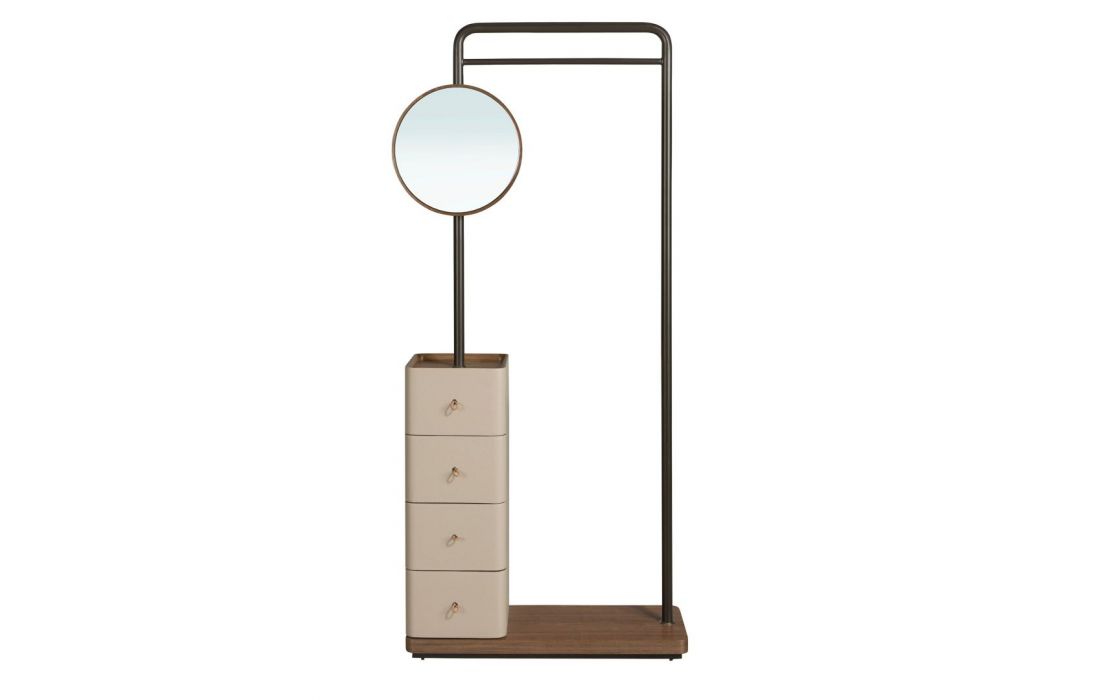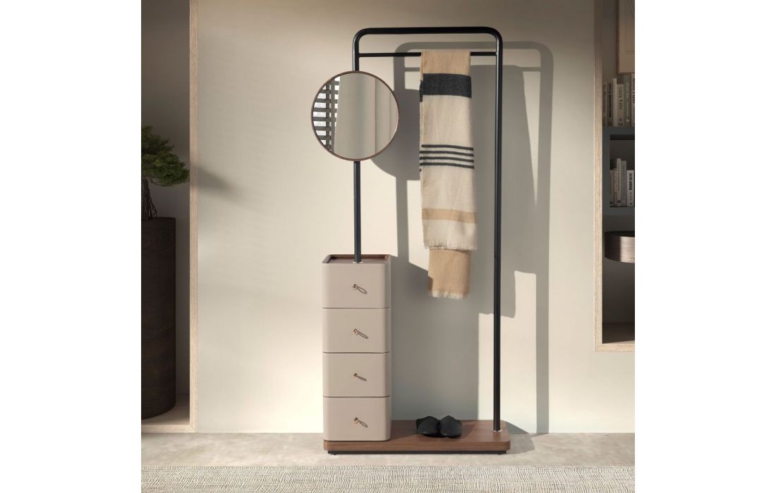 This modern coat rack in natural walnut veneer, combined with elegant cowhide upholstery, and a stainless steel base and frame, is ideal for enjoying a relaxing and peaceful moment of self-careRecipient :