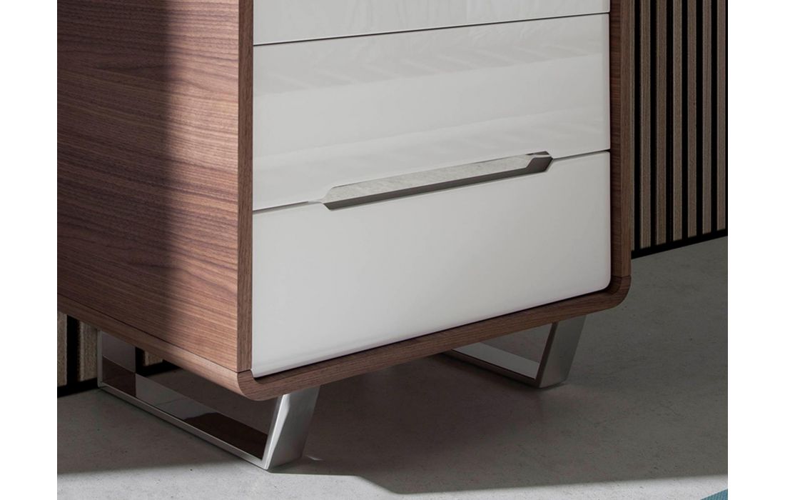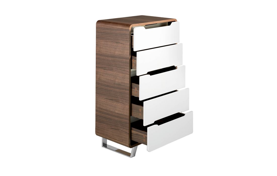 Tall chest of drawers in walnut veneered wood with five drawers in glossy white lacquered MDF. Chrome-plated stainless steel feet and handles.