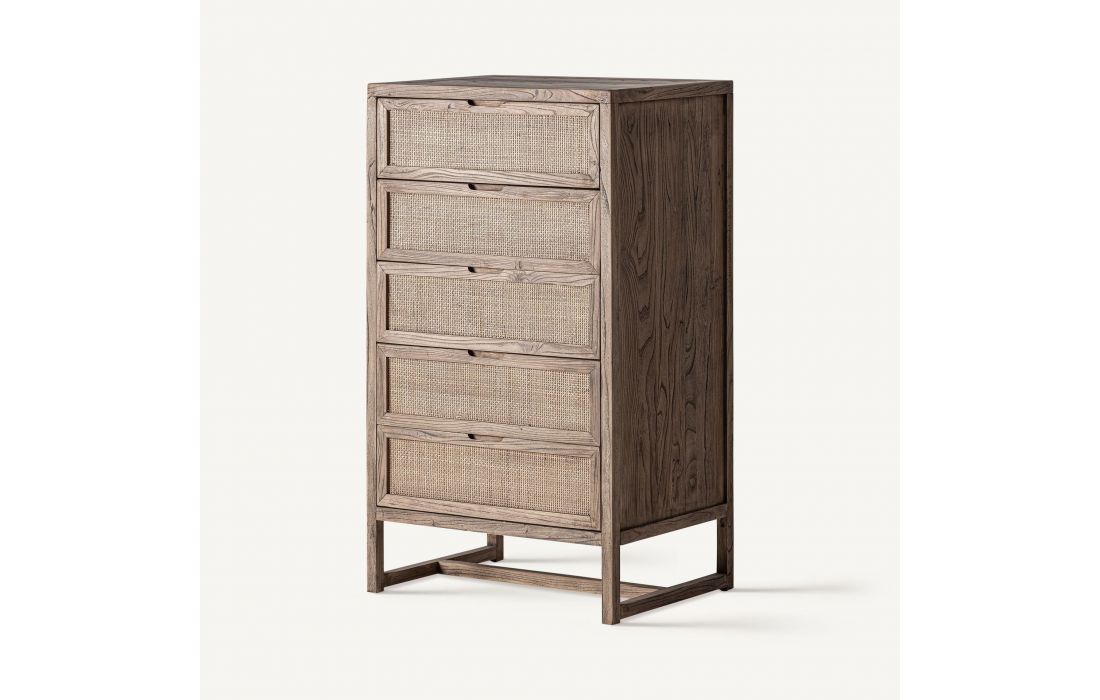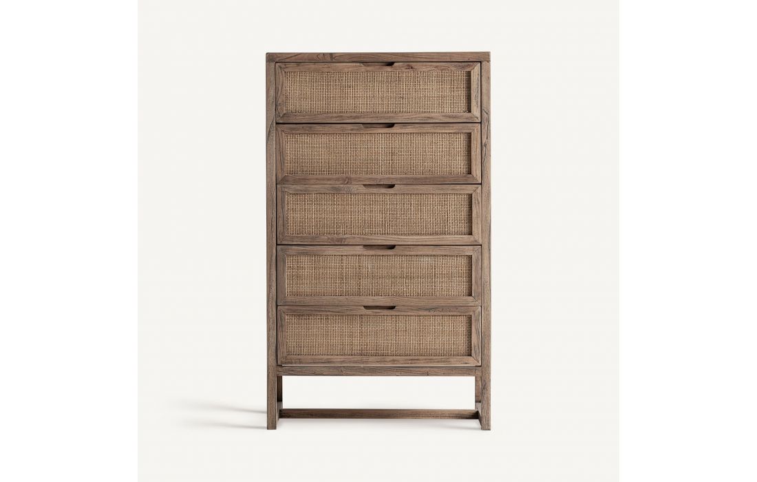 Tall chest of drawers in elm wood with straw details, featuring an elegant and lightweight design. With 5 drawers, it offers ample storage. Ideal for bedrooms, it combines functionality with a natural and contemporary touch.