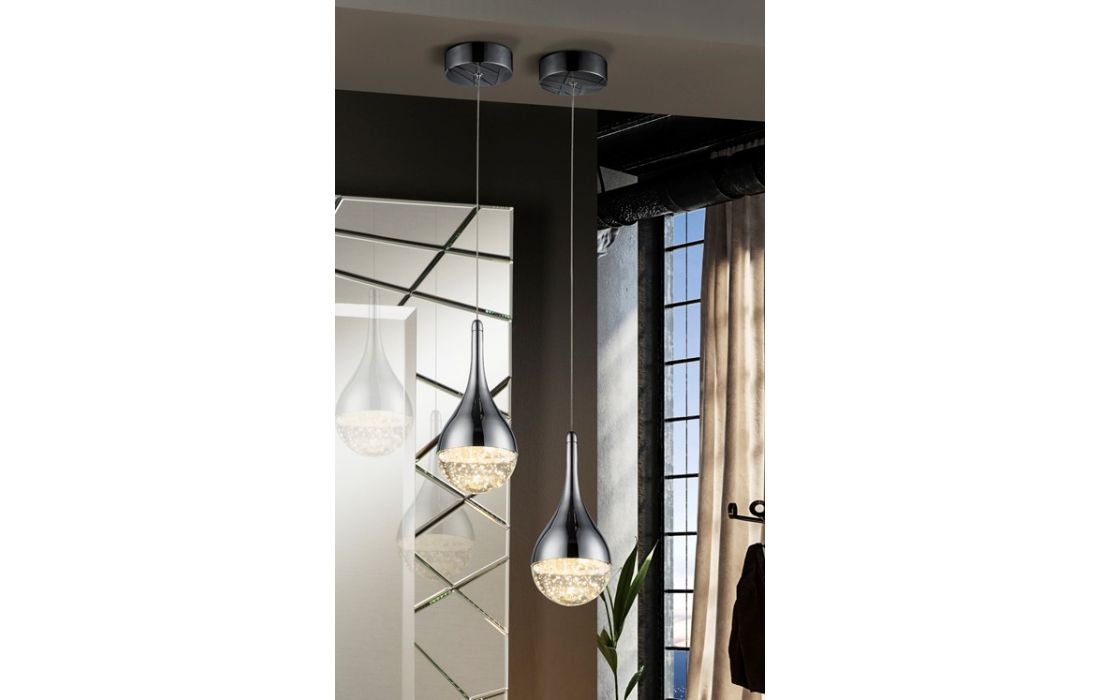 1 LED metal light with chrome finish. Drop shaped tulip in solid glass with decorative bubbles inside.