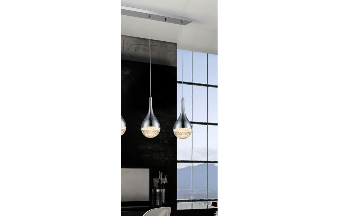 3 LED metal chandelier with chrome finish. Drop shaped tulip in solid glass with decorative bubbles inside.