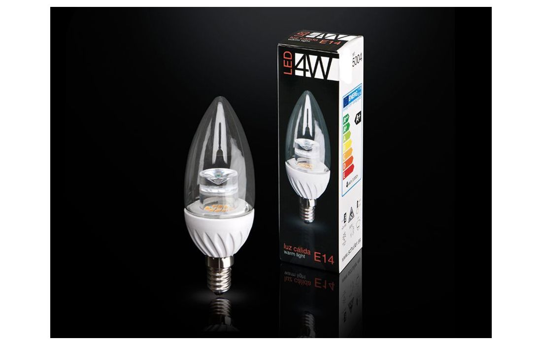 Transparent 4W LED candle light. Warm light equivalent to a 32 W incandescent 320 lumens. 3000K. For E14 socket.