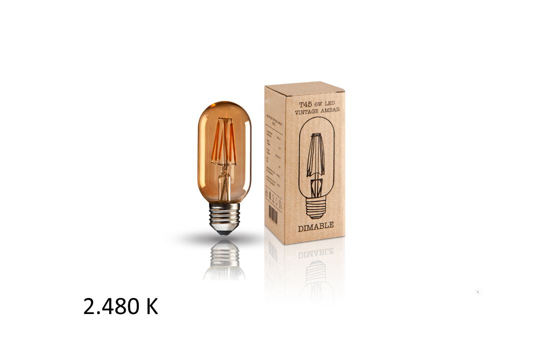 Vintage LED dimmable lamp T45 6W. Warm light. Amber colored glass, inner LED filament. 400 lm. 2,480 K. 360 ° light beam. For E27 socket.