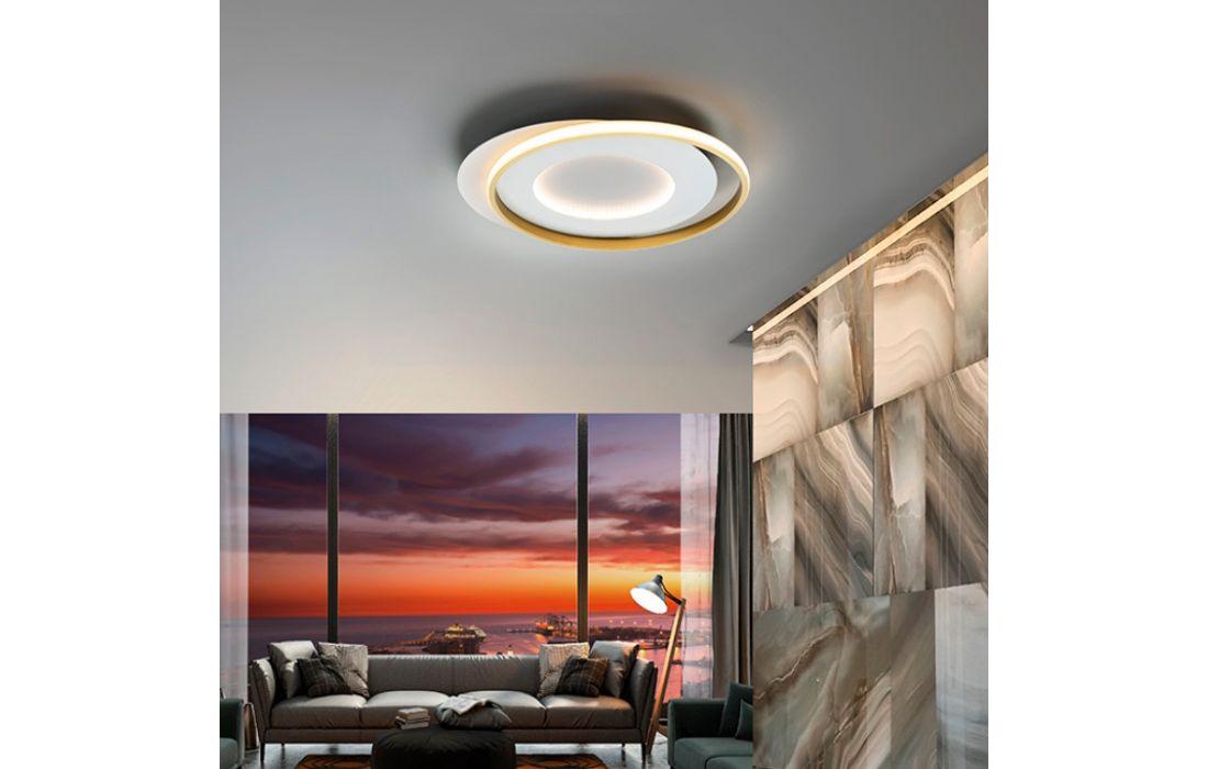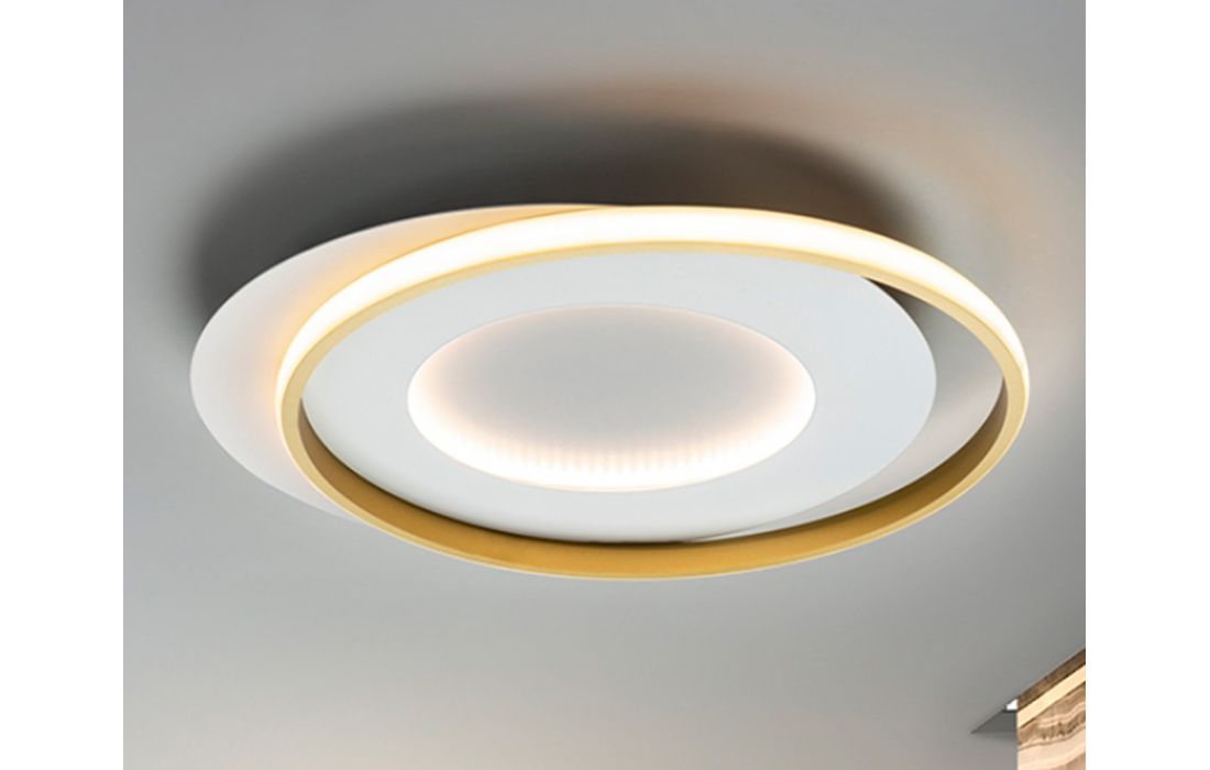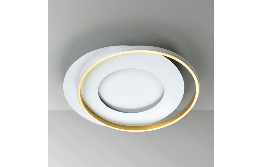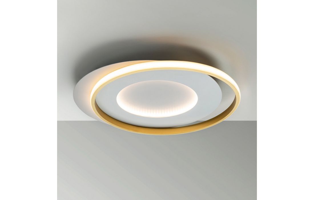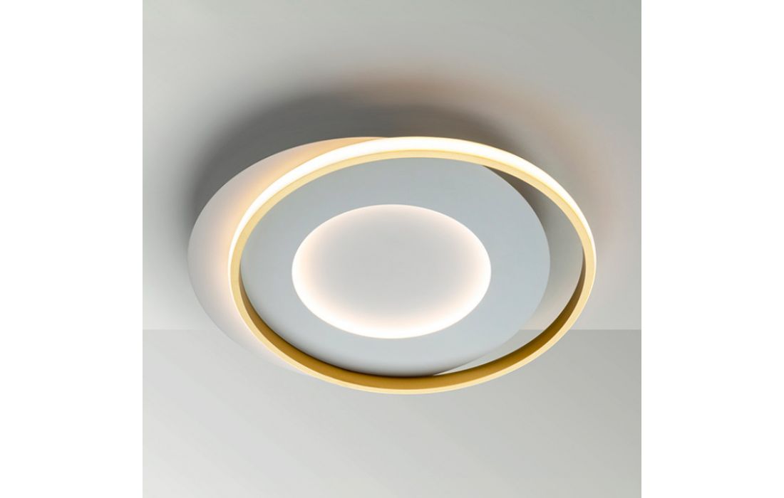 Ceiling lamp made of metal and aluminum, matt white and gold finish. Opaline silicone diffuser.