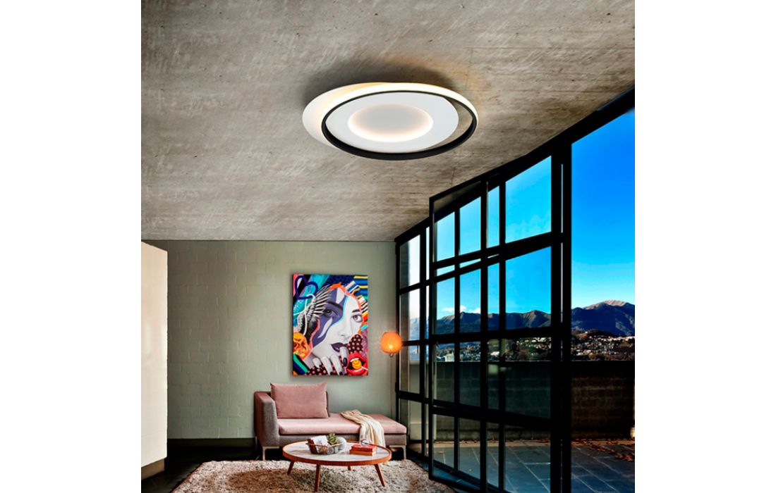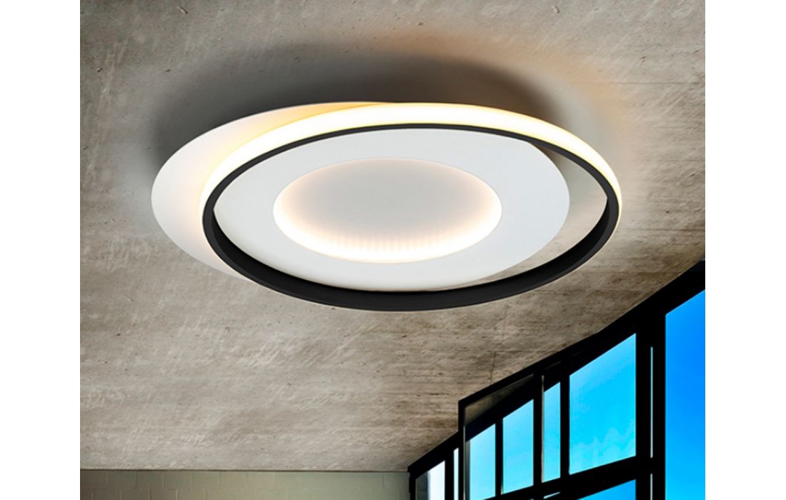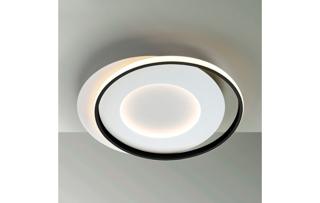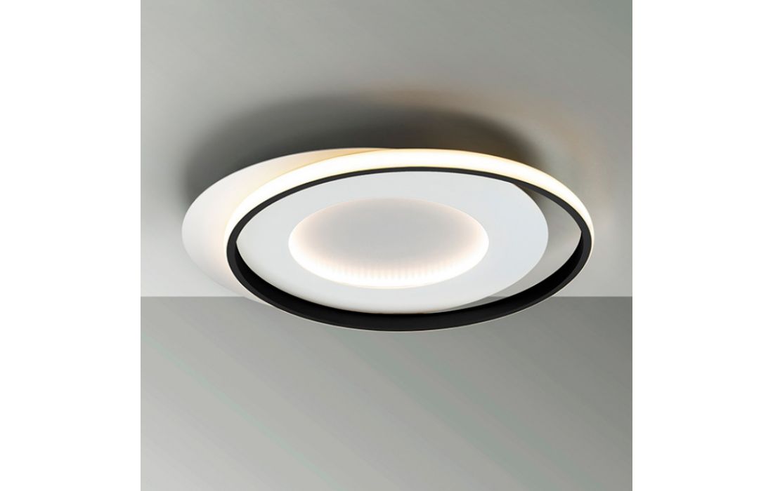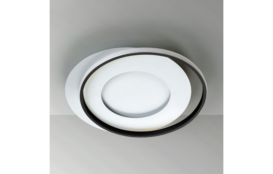 Ceiling lamp made of metal and aluminum, matt white and black finish. Opaline silicone diffuser.