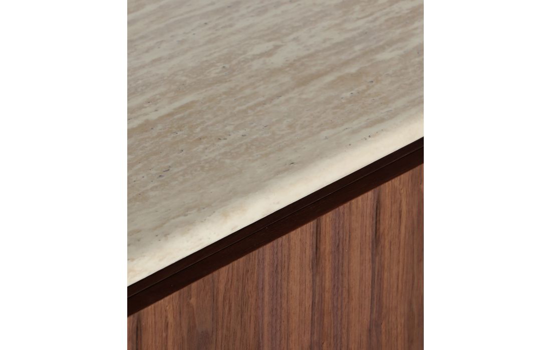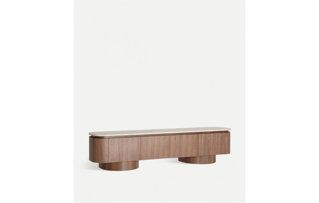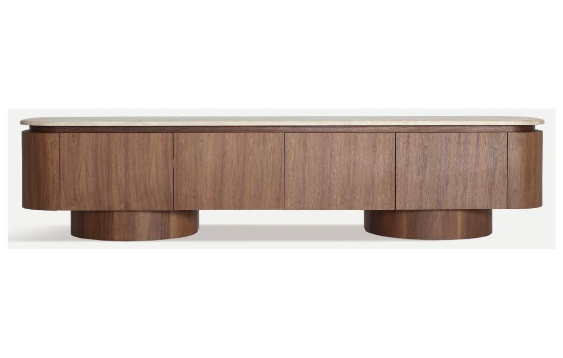 The TV base stands out for its balanced design and materials. Ideal for salons seeking serenity, beauty, and functionality.