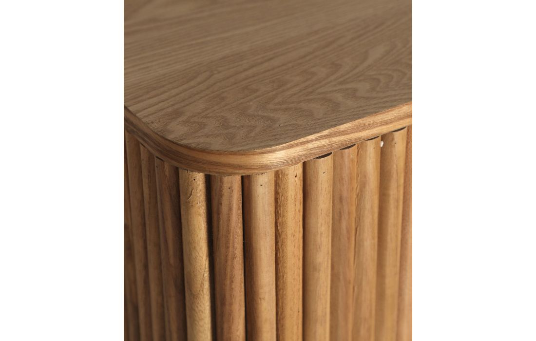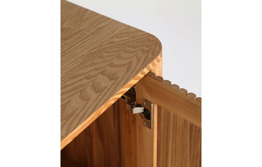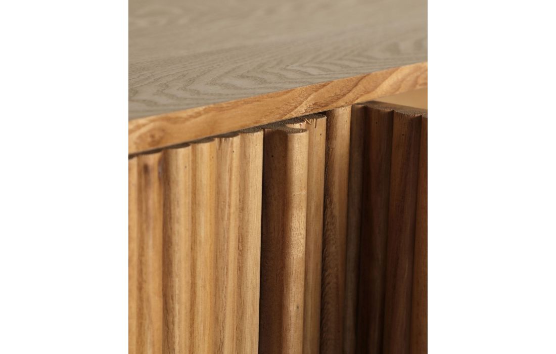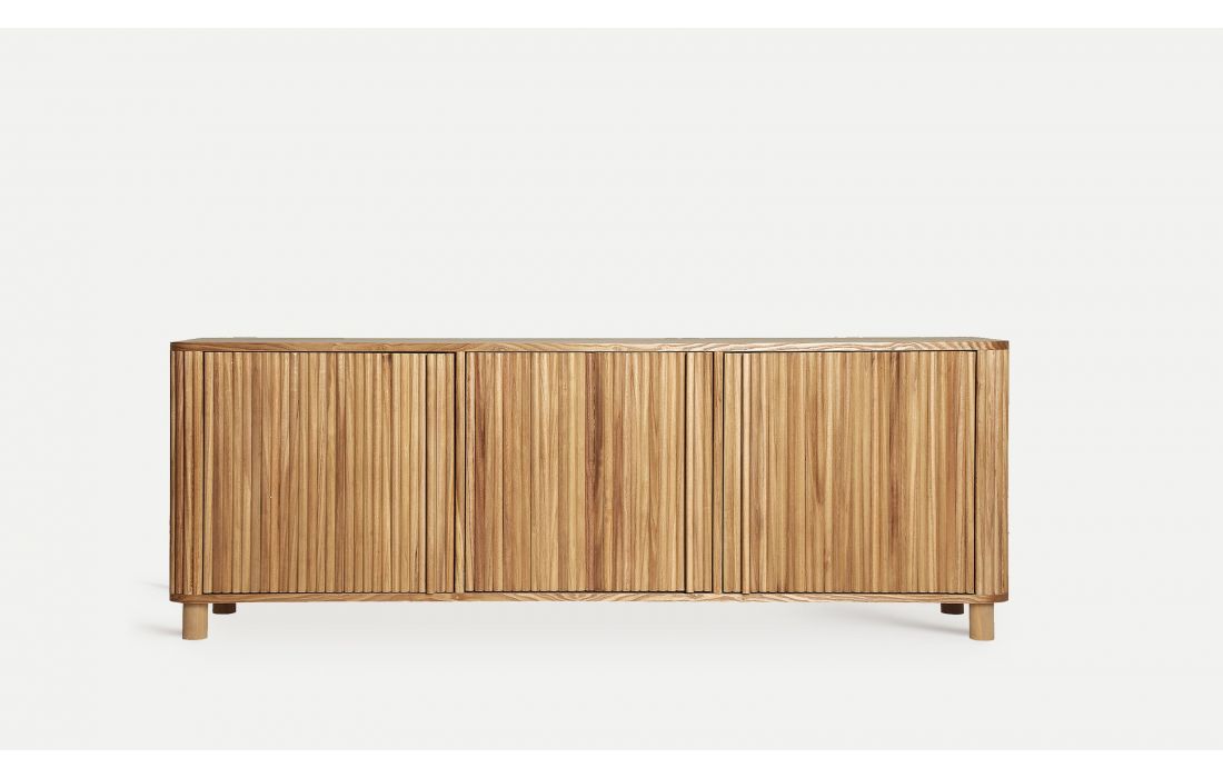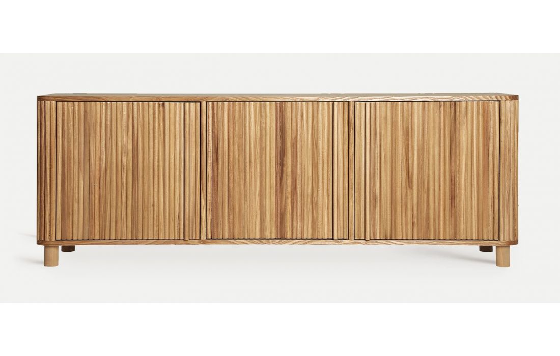 Nordic-style TV stand made of wood. Its low rectangular structure is ideal for TVs and electronic devices. It features fluted sliding doors that provide texture and allow easy access to storage.