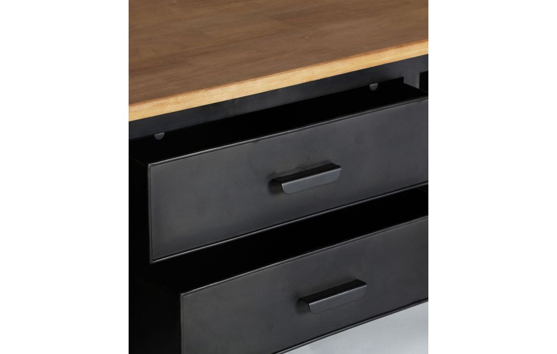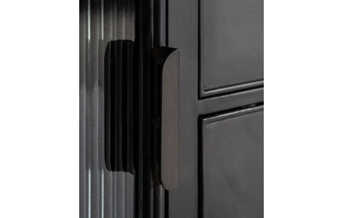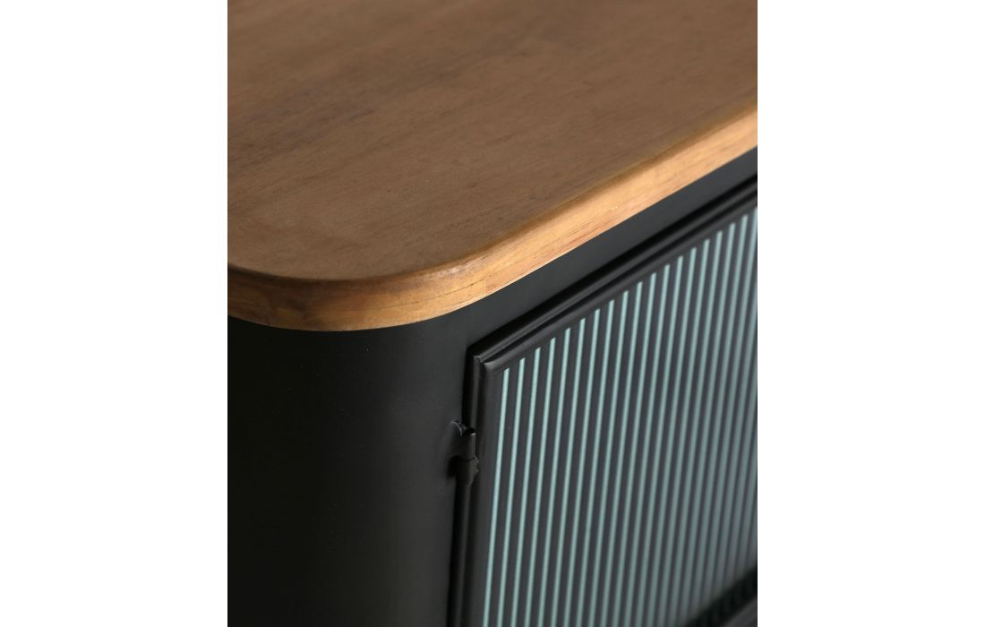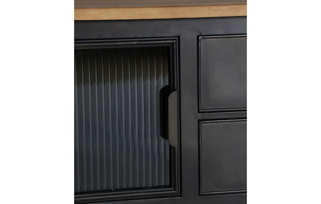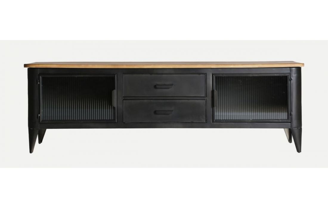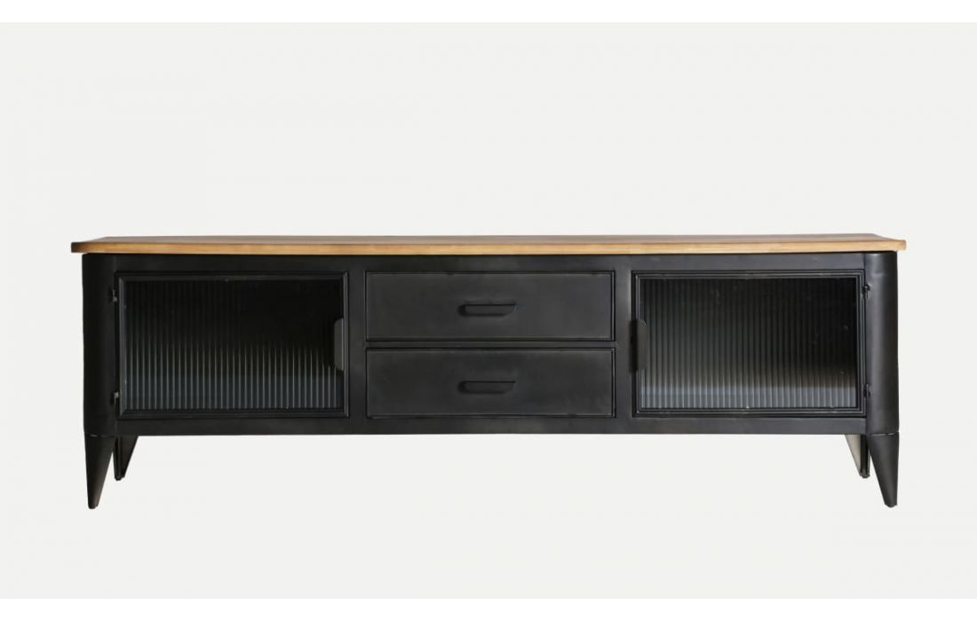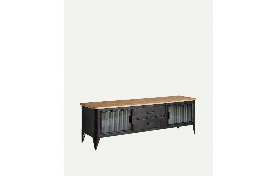 The BASE TV EASBY stands out for its elegant industrial style and functional design. Made of black iron with translucent glass doors and wood, this piece brings character and practicality to any living room.