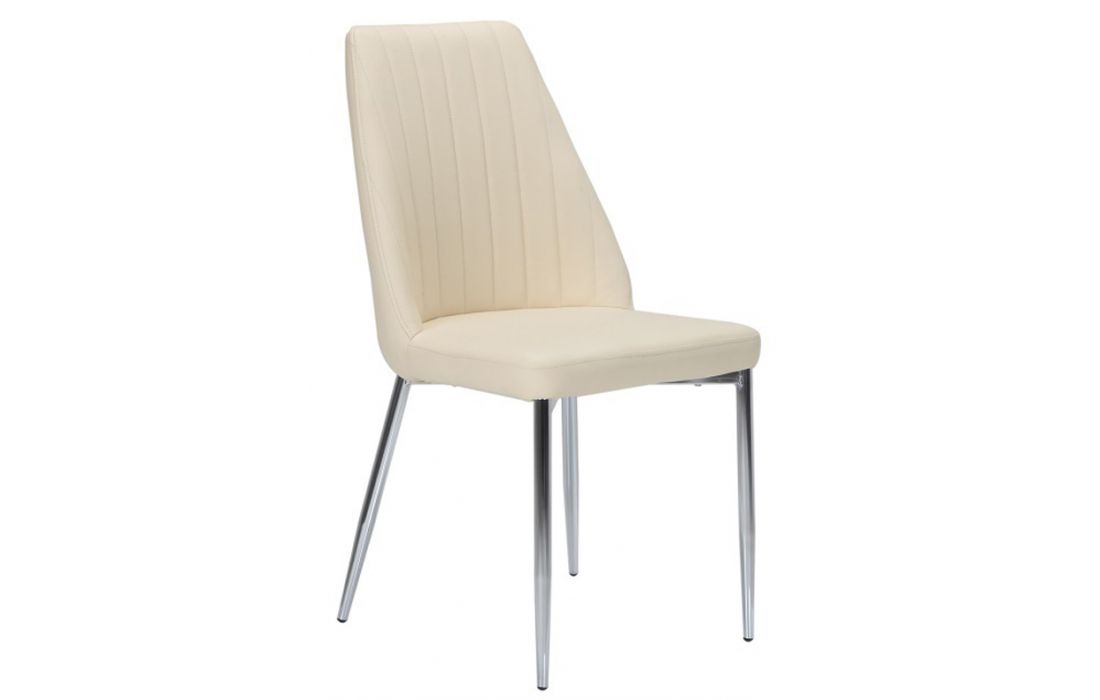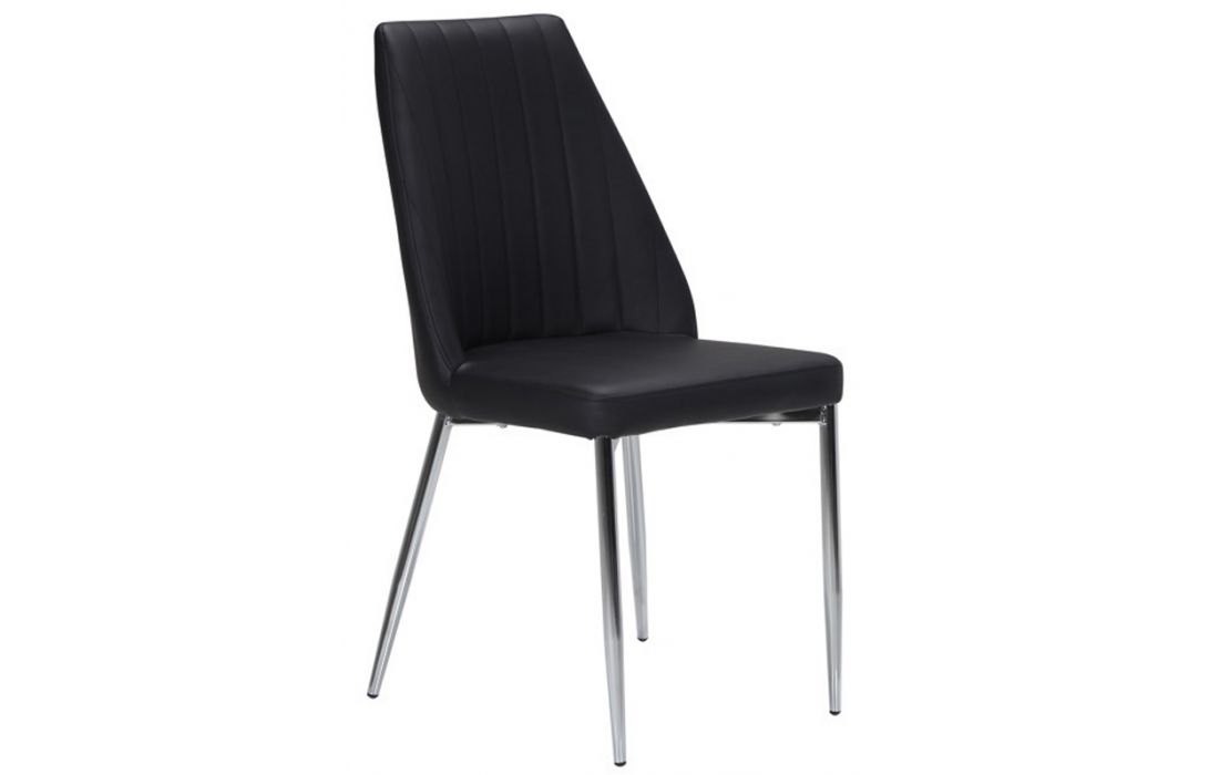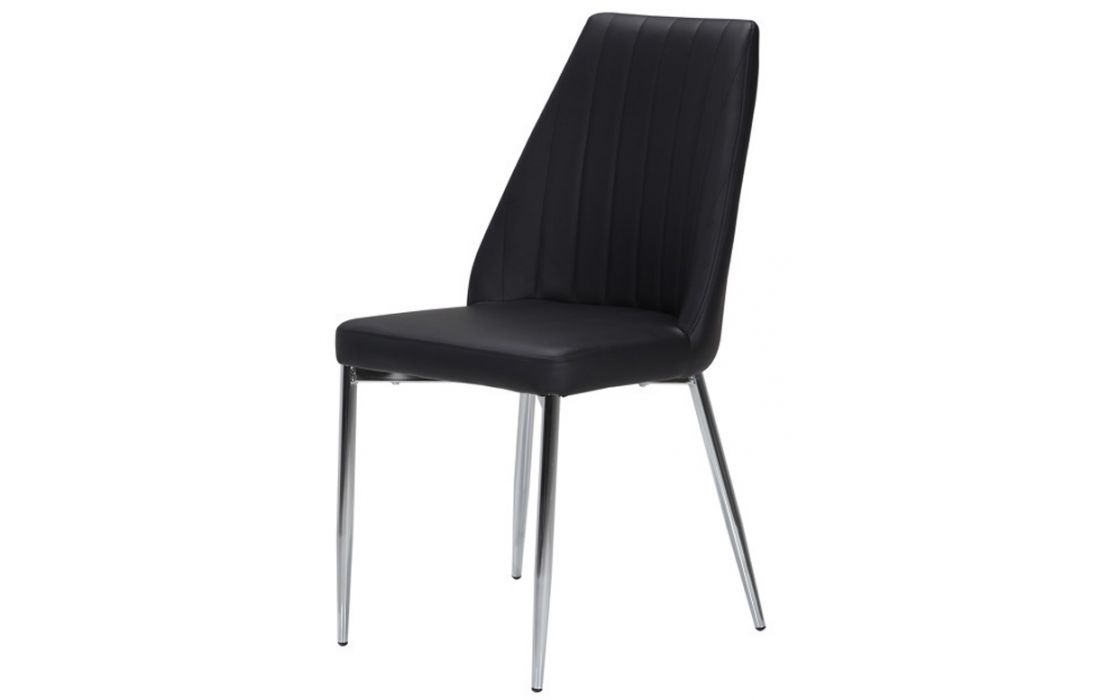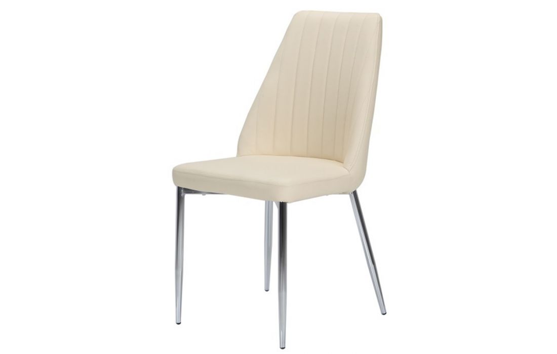 Chair with chromed metal legs and upholstered in black, white and beige synthetic leather.