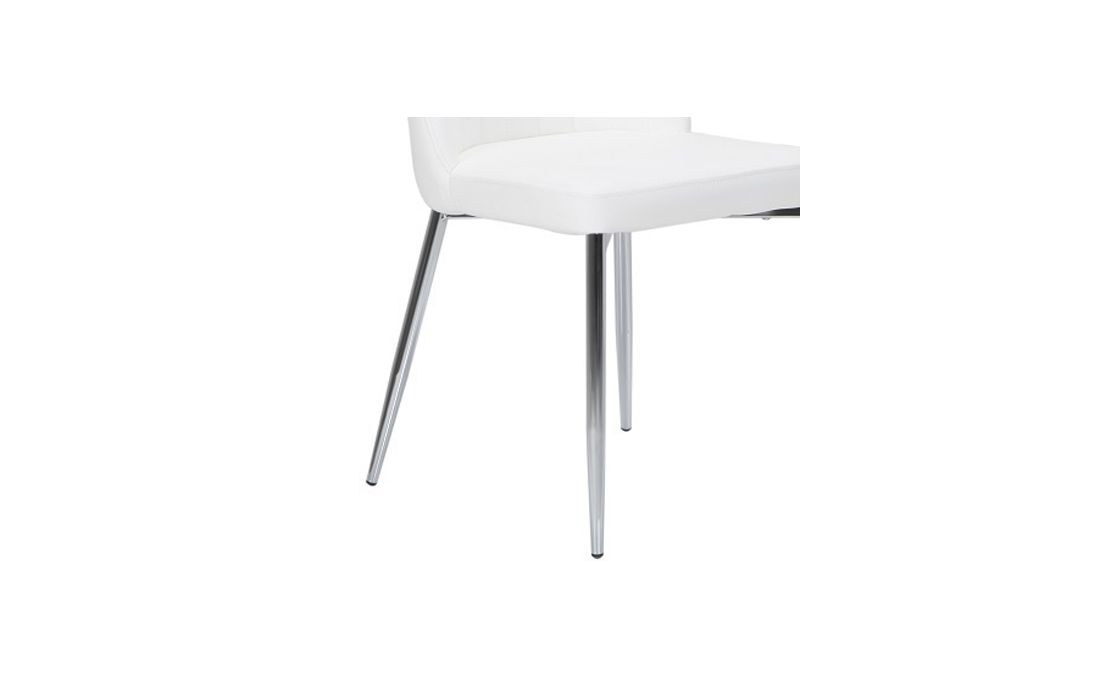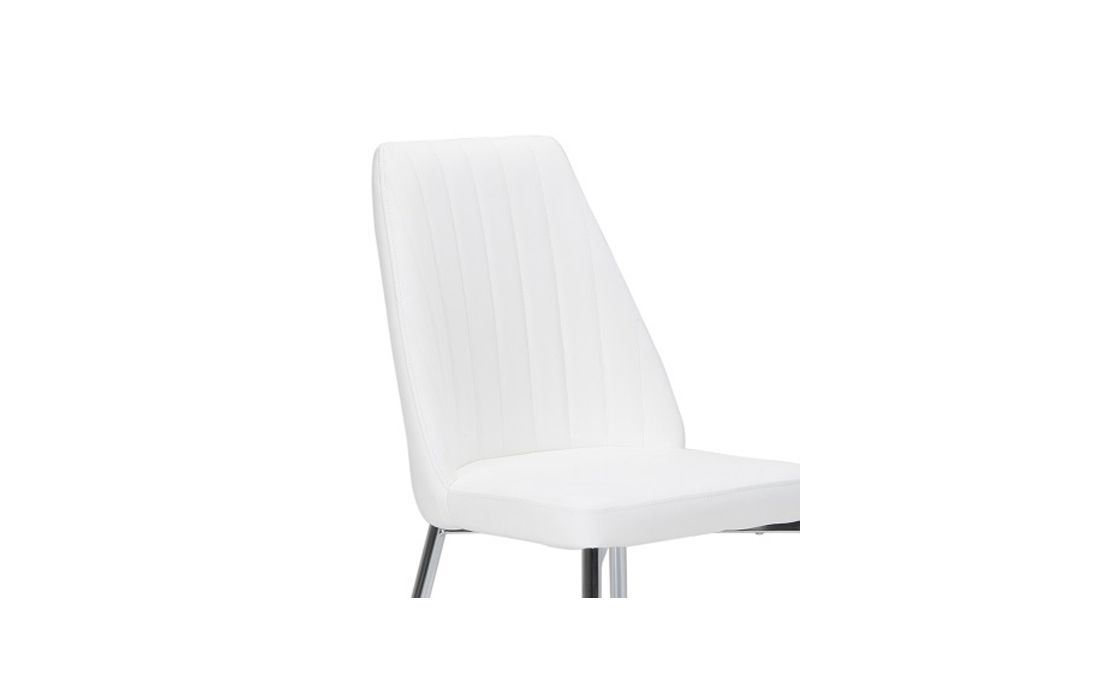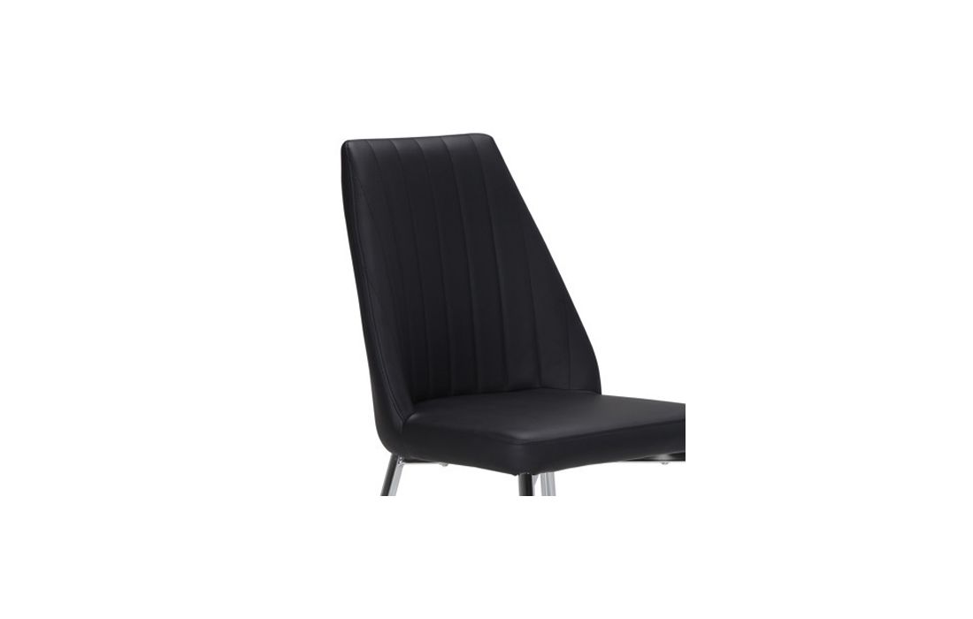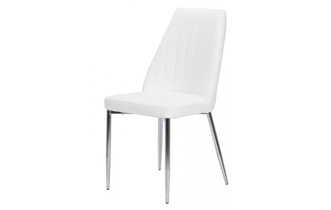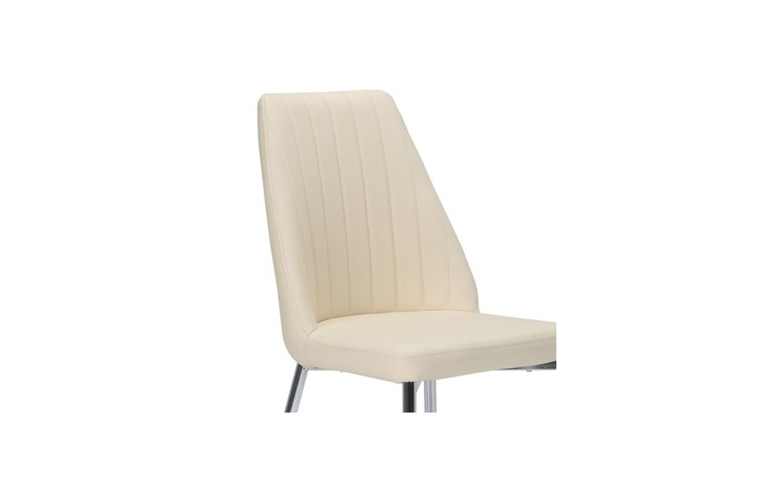Chair with chromed metal legs and upholstered in black, white and beige synthetic leather.