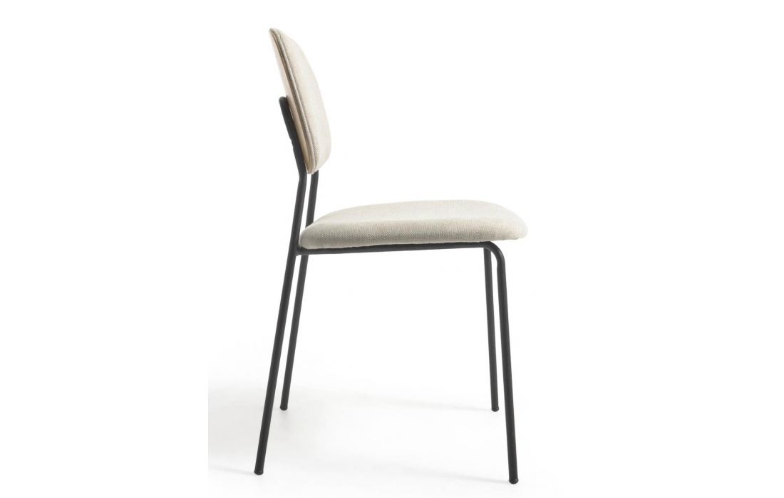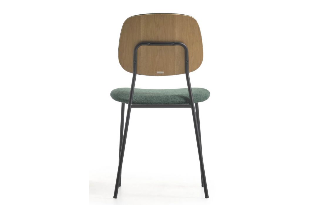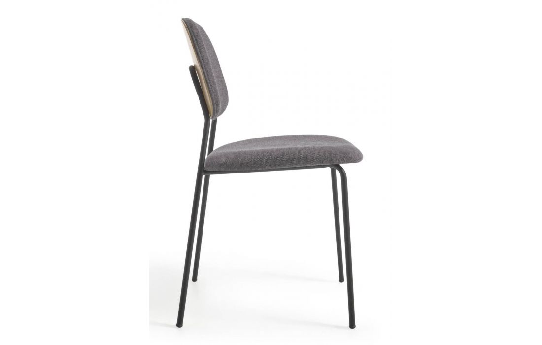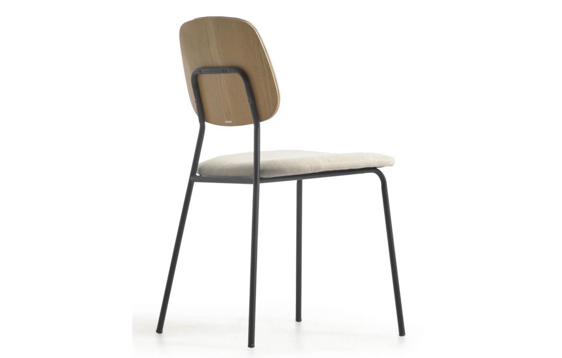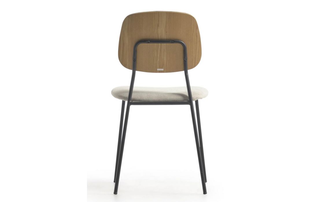 Chair with black metal frame and oak veneer with fabric upholstery, available in beige, dark gray and dark green