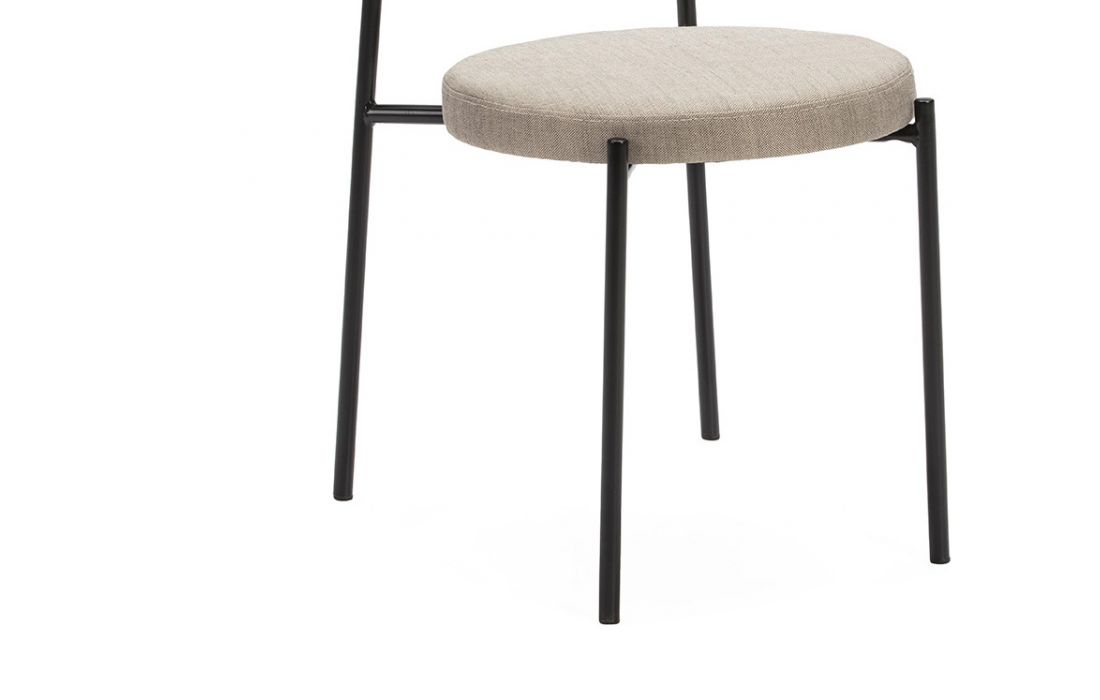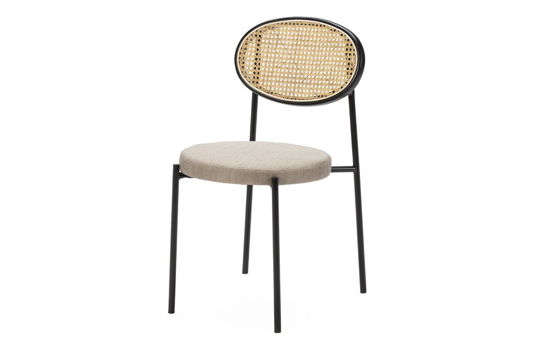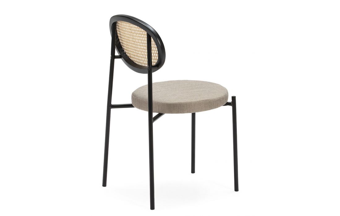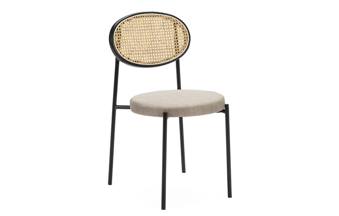Chair with black metal frame, natural rattan back and gray fabric seat