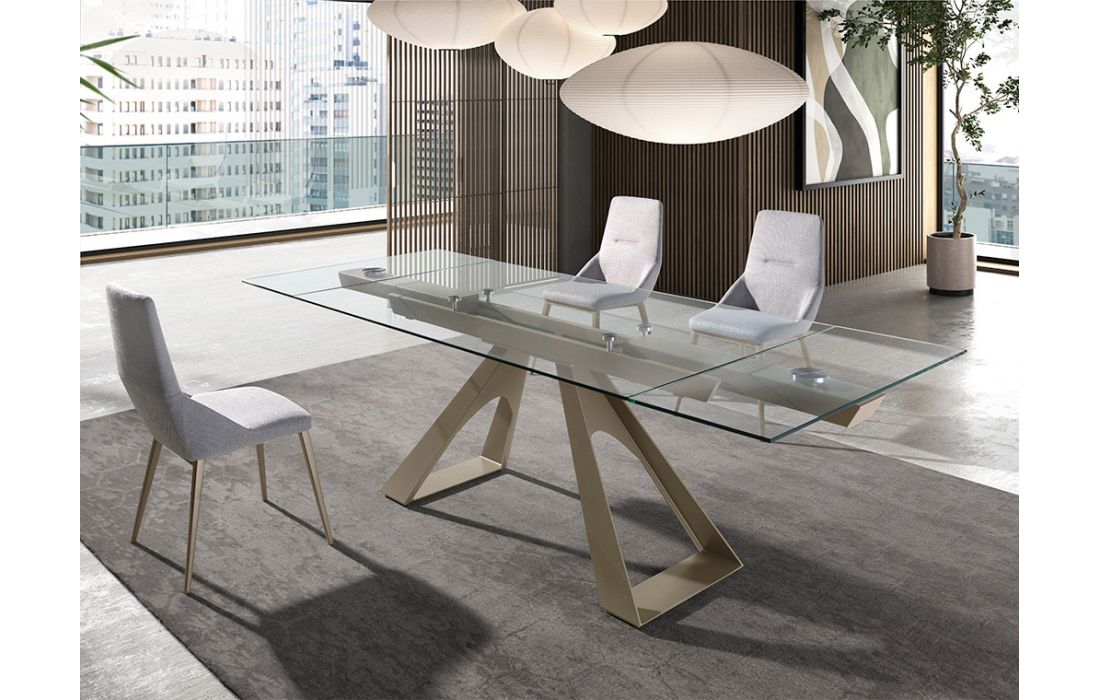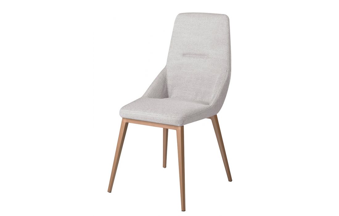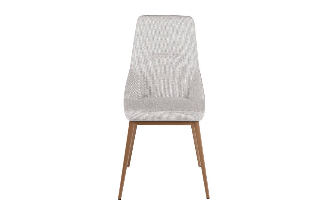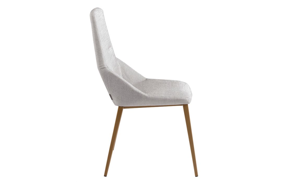 Chair with gold stainless steel legs and light gray fabric upholsteryDimensions in cm