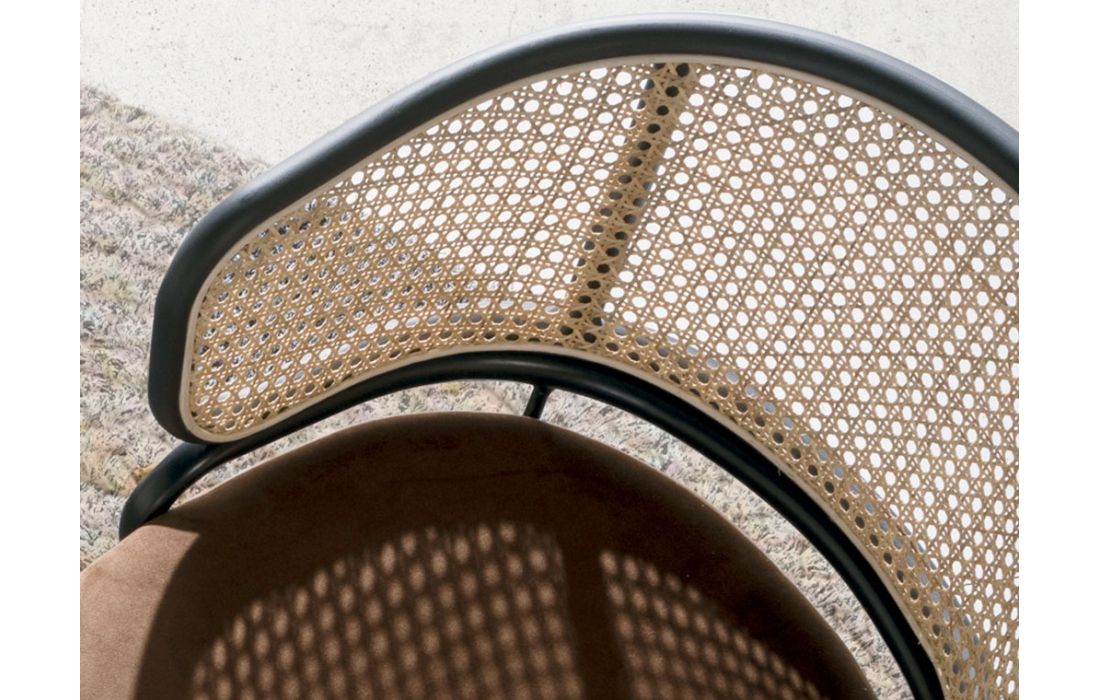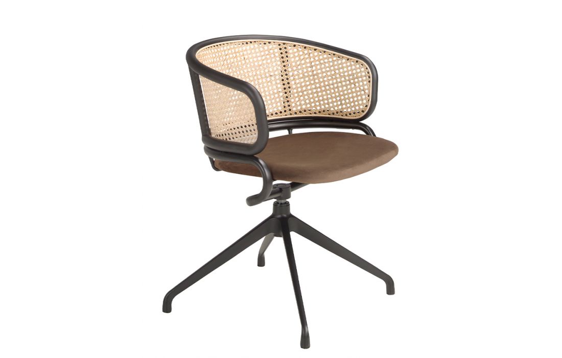 Swivel arm chair, upholstered in brown velvety fabric and back in natural cane with black stainless steel structure