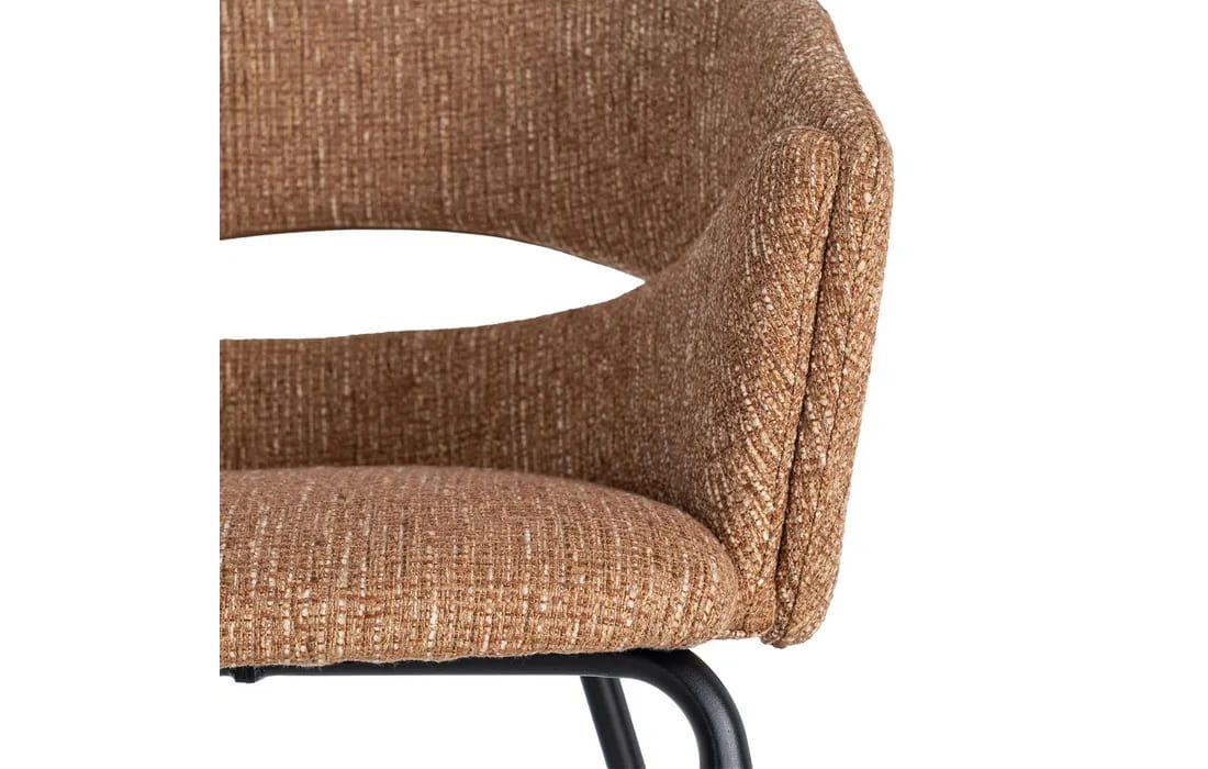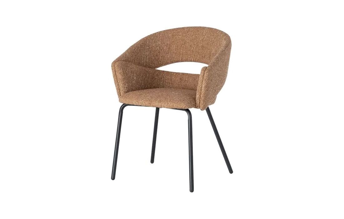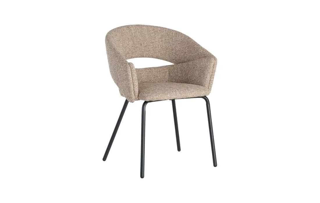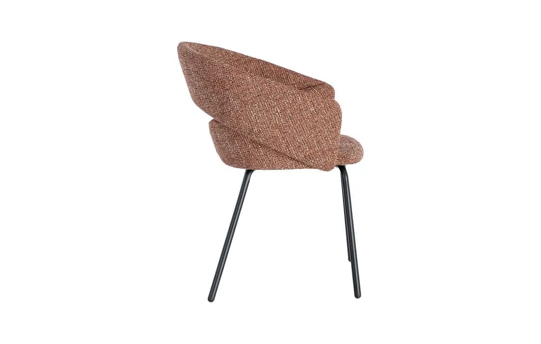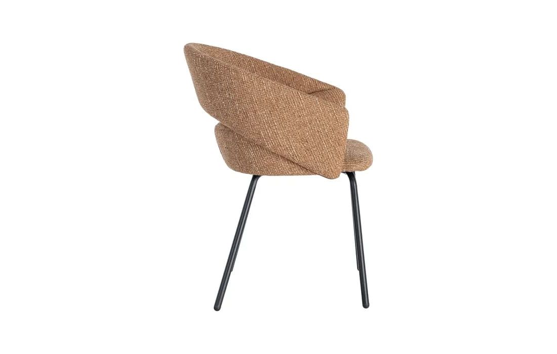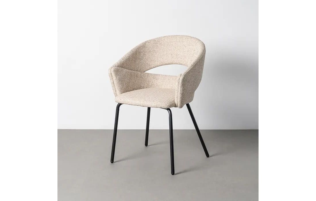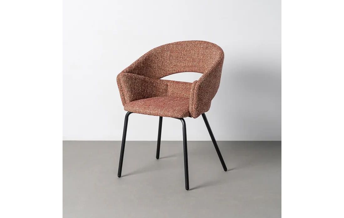 This chair features a modern and elegant design, combining a metal frame with a fabric-covered seat and backrest for comfort. The curved lines of the wraparound backrest offer ergonomic support, while the metal legs ensure stability. Available in beige, taupe, light brown, terracotta, and blue.Recipient :
