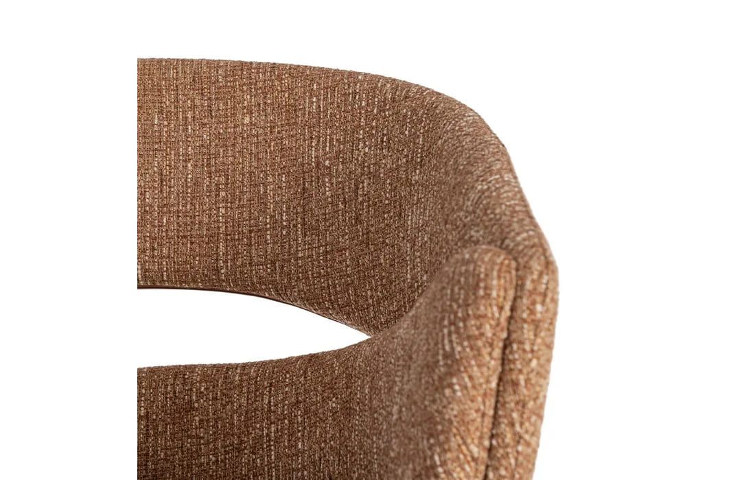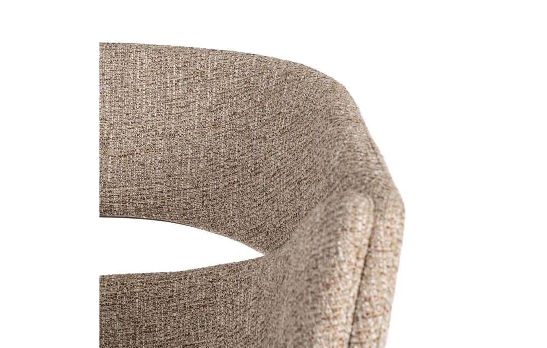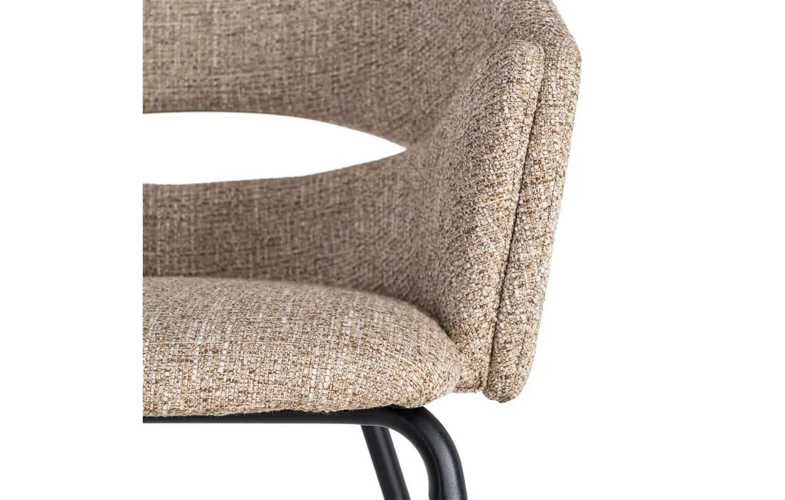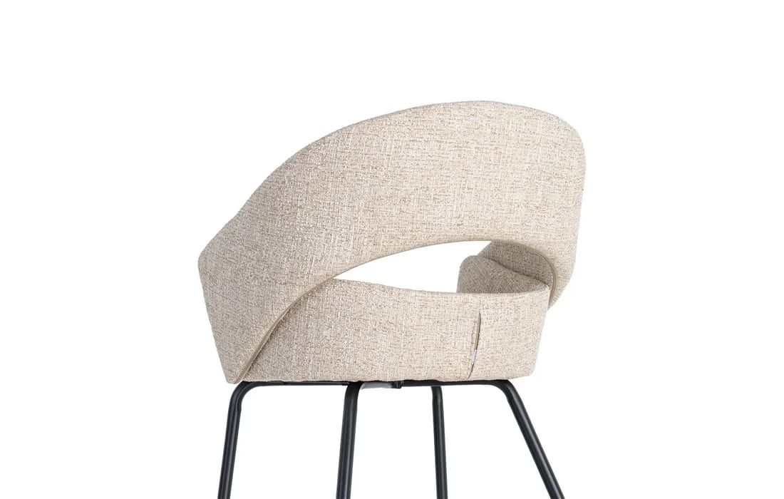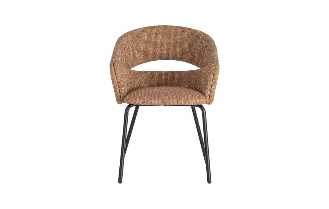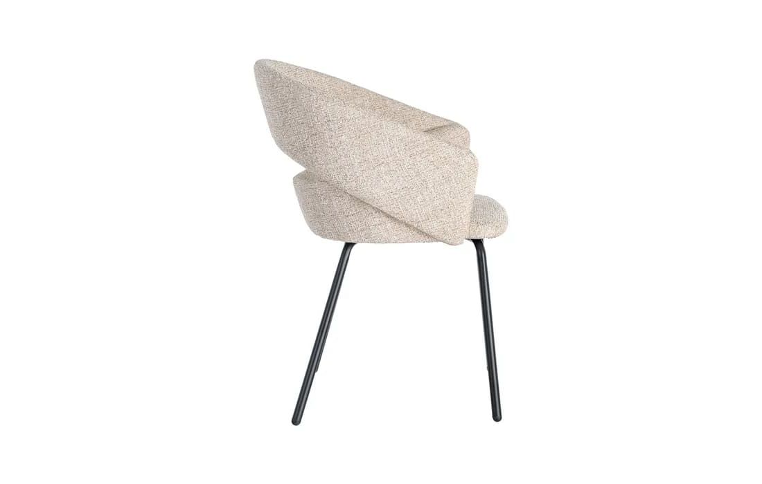 This chair features a modern and elegant design, combining a metal frame with a fabric-covered seat and backrest for comfort. The curved lines of the wraparound backrest offer ergonomic support, while the metal legs ensure stability. Available in beige, taupe, light brown, terracotta, and blue.Recipient :