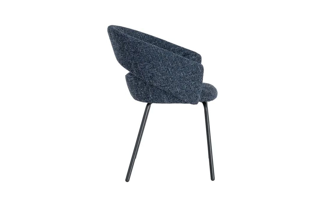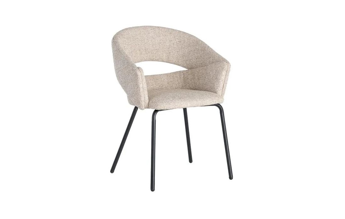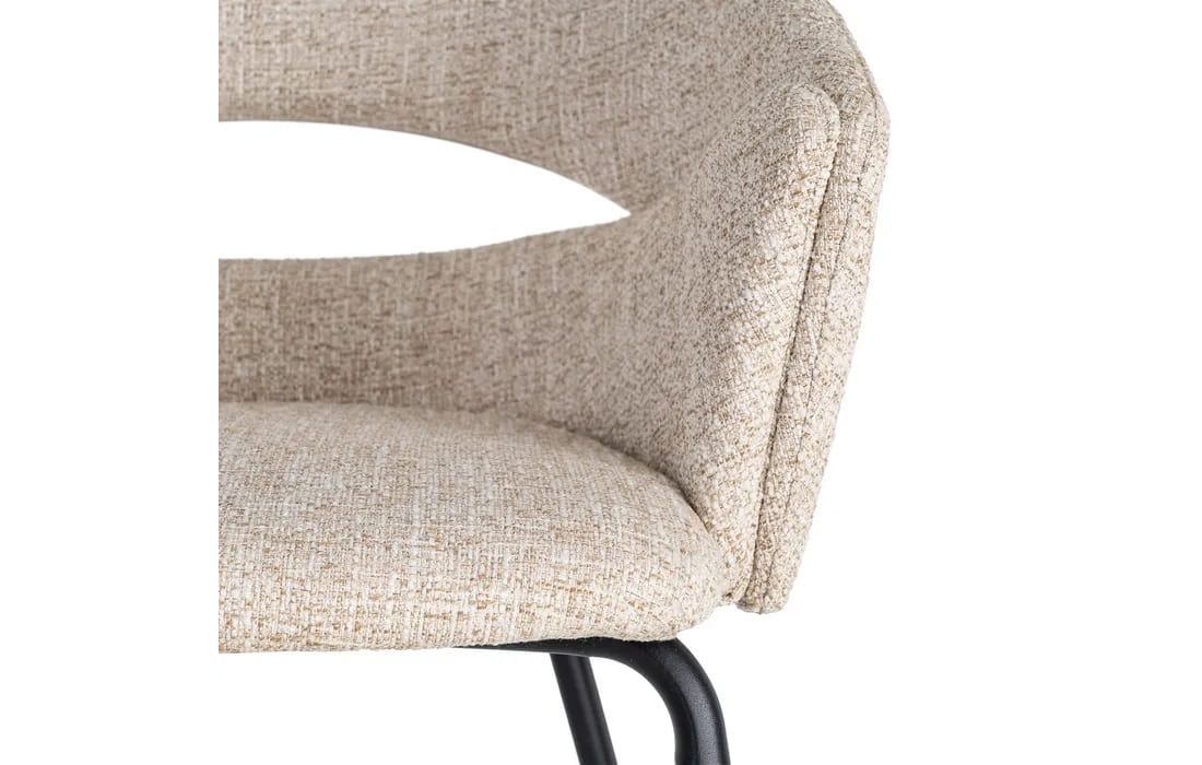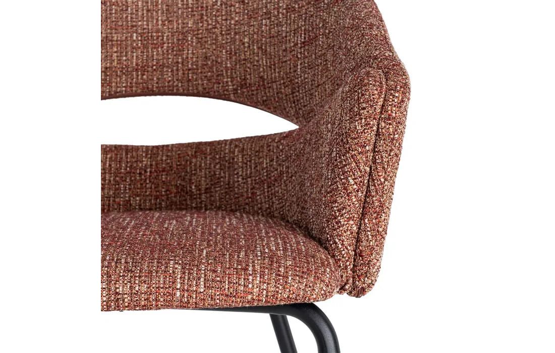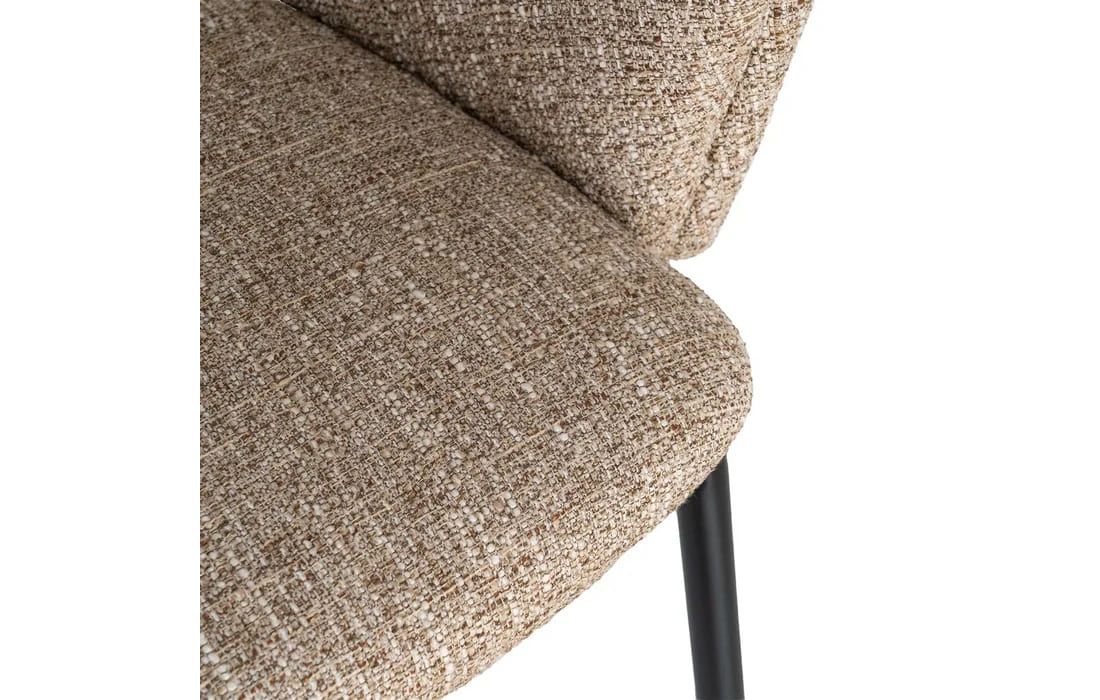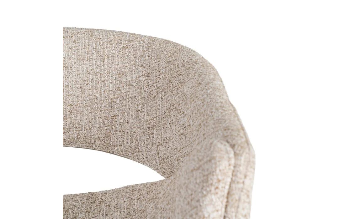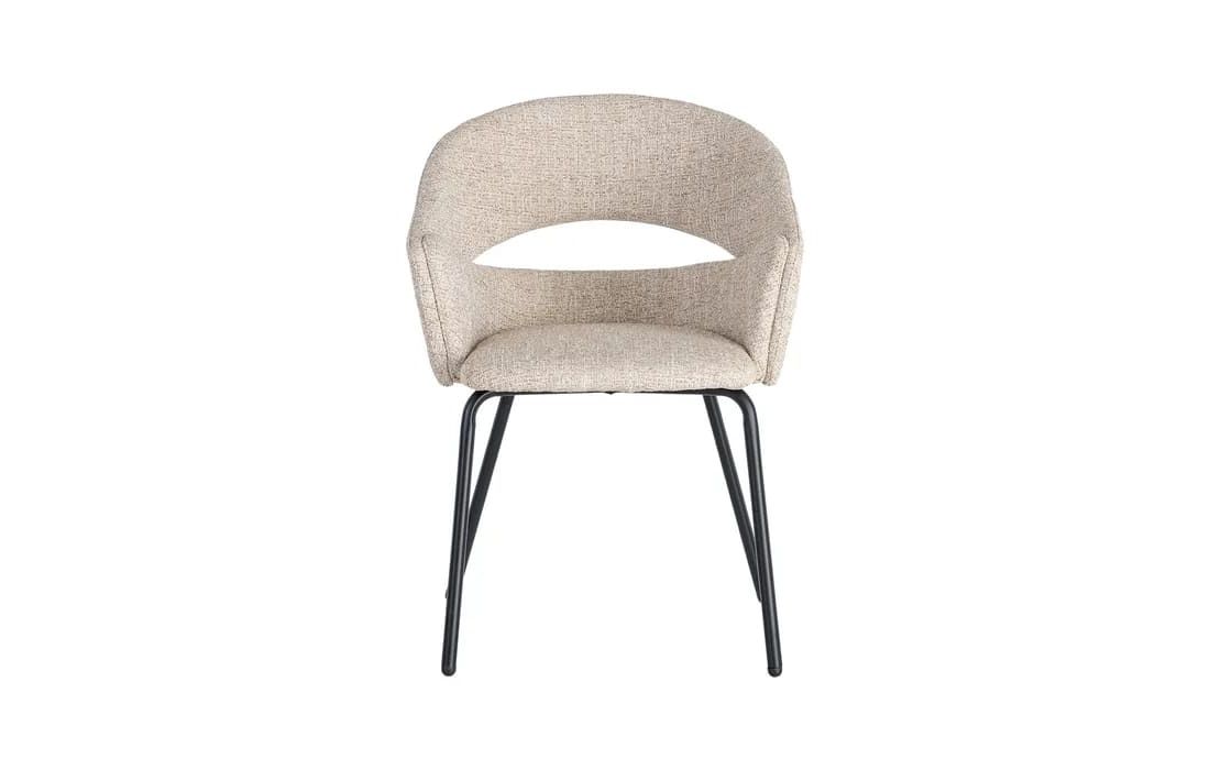 This chair features a modern and elegant design, combining a metal frame with a fabric-covered seat and backrest for comfort. The curved lines of the wraparound backrest offer ergonomic support, while the metal legs ensure stability. Available in beige, taupe, light brown, terracotta, and blue.Recipient :
