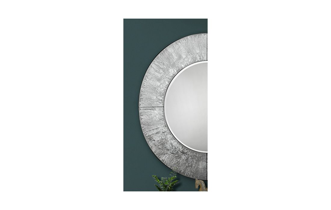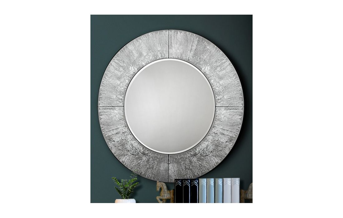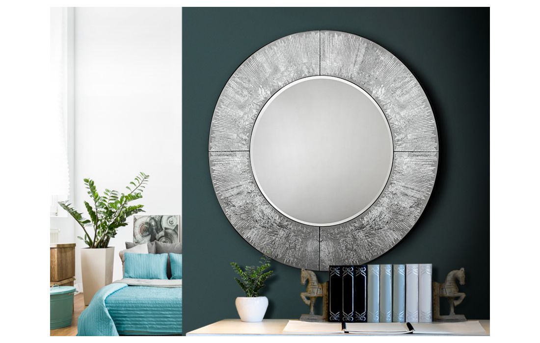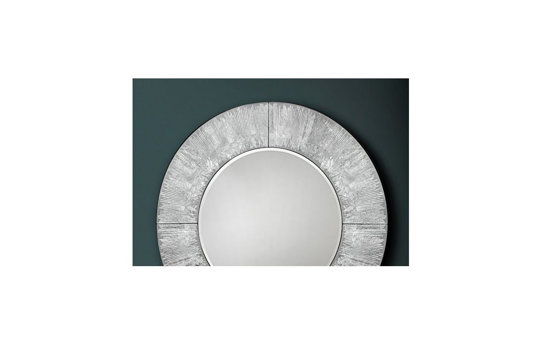 Mirror with beveled central moon and glass frame with silver foil graphics and black MDF backs.