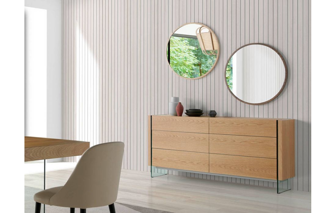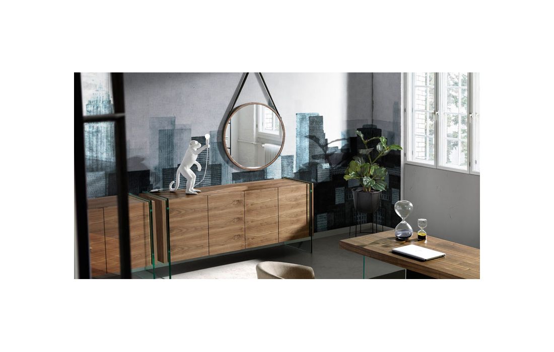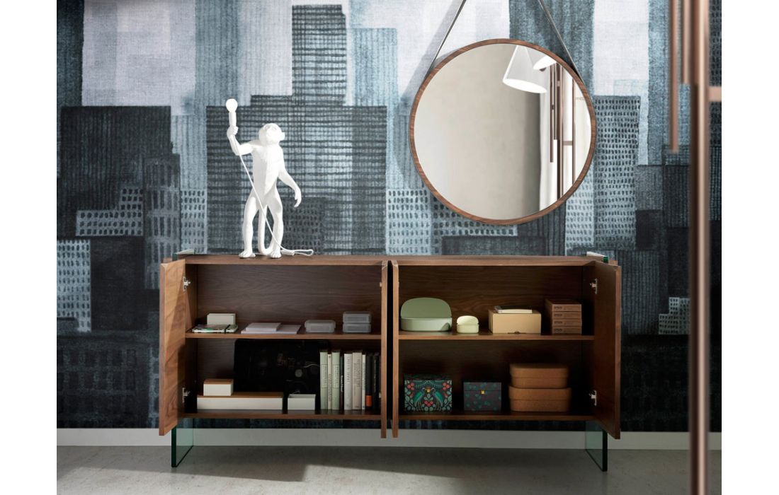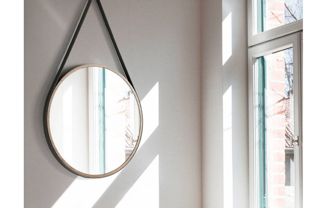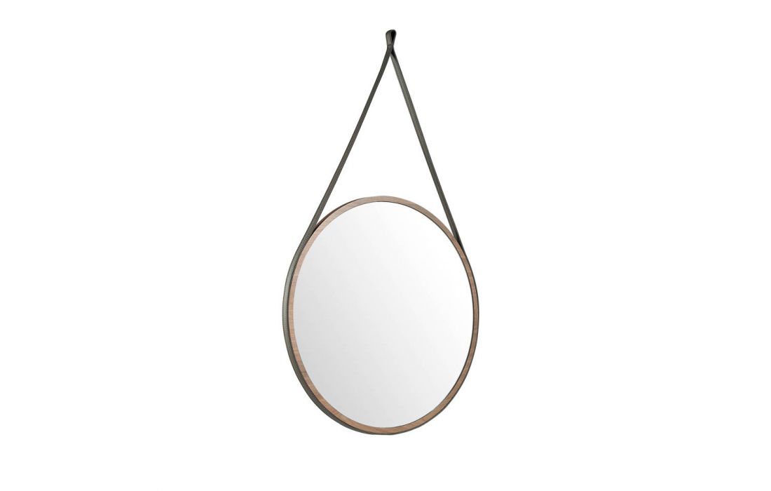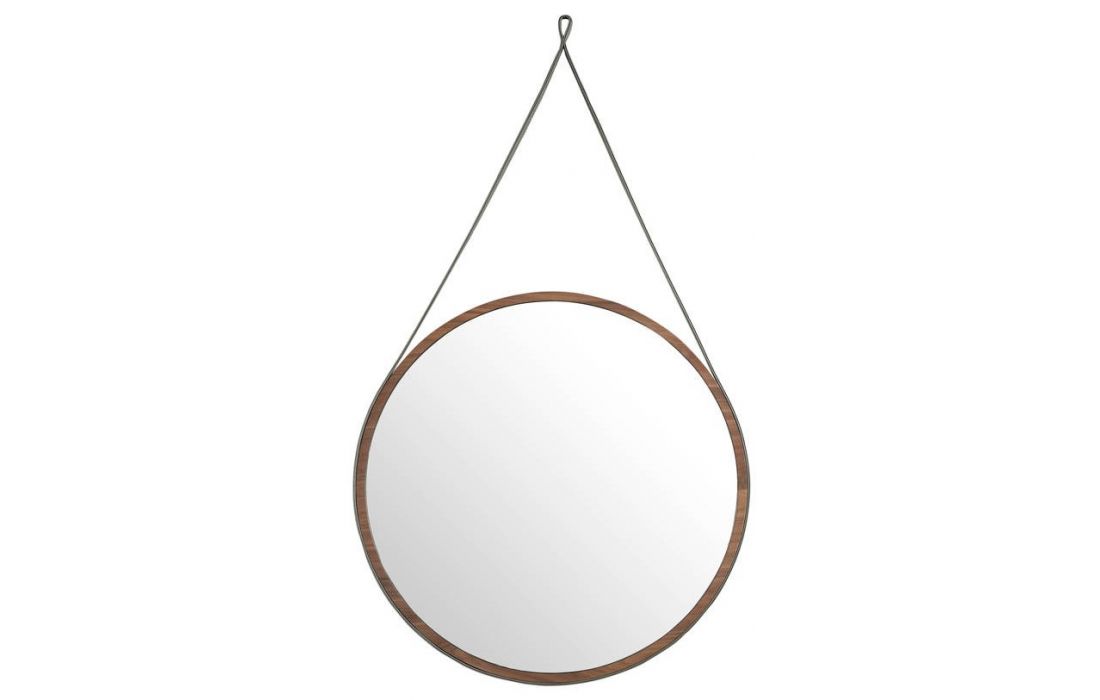 Mirror made of walnut-veneered wood.