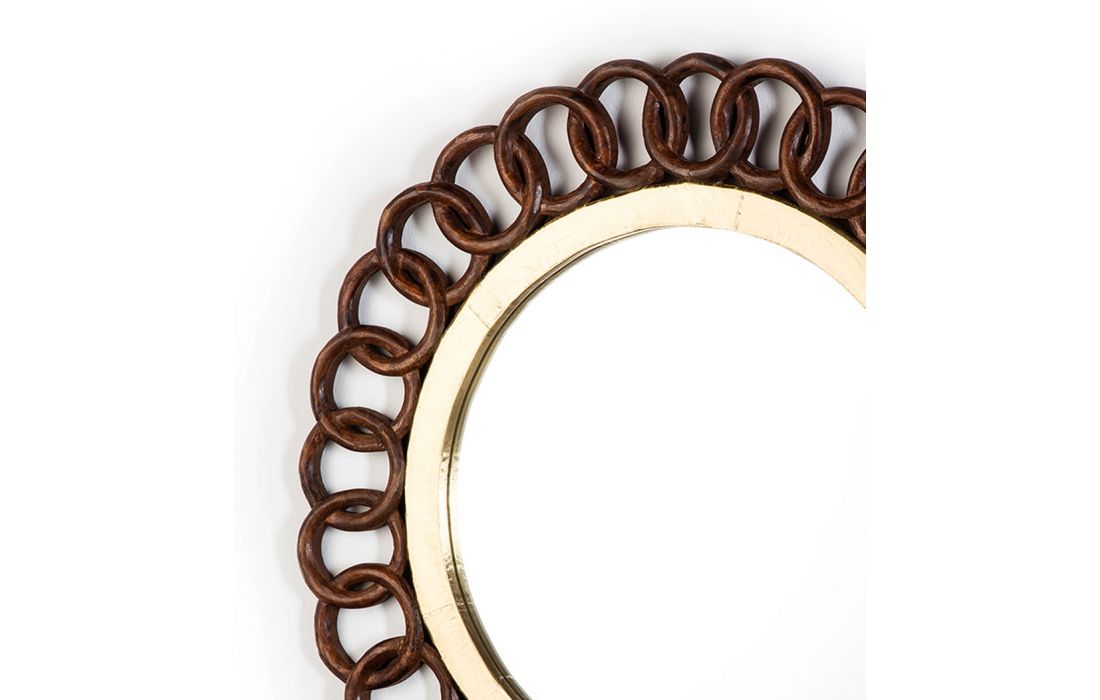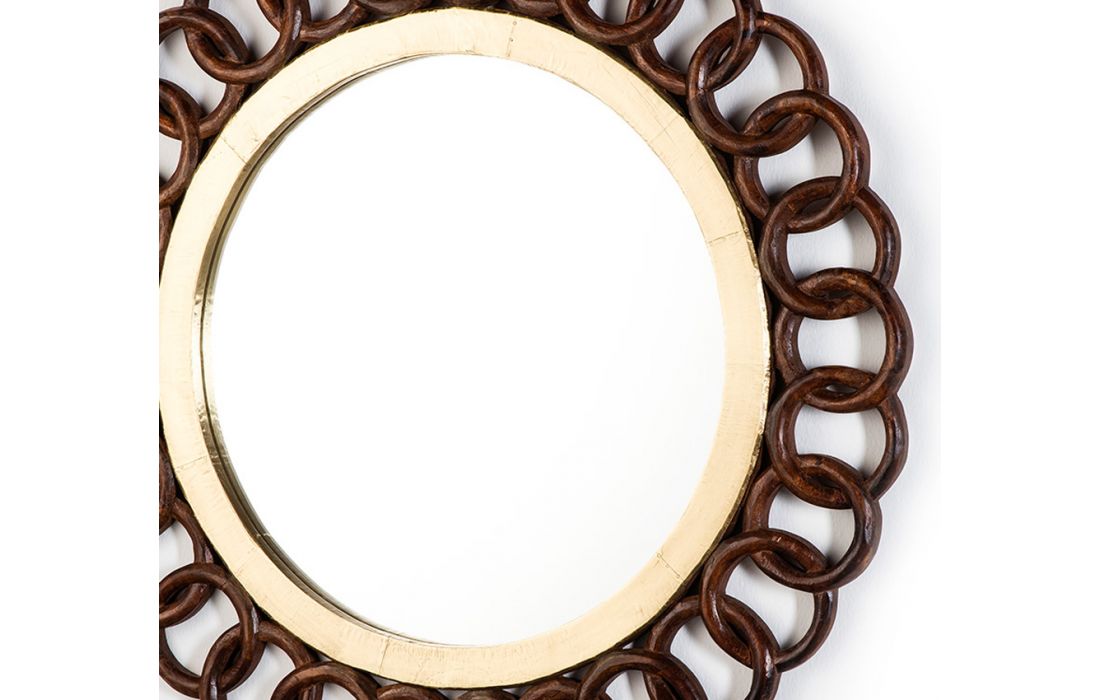 Round mirror with brown and tin wood frame.