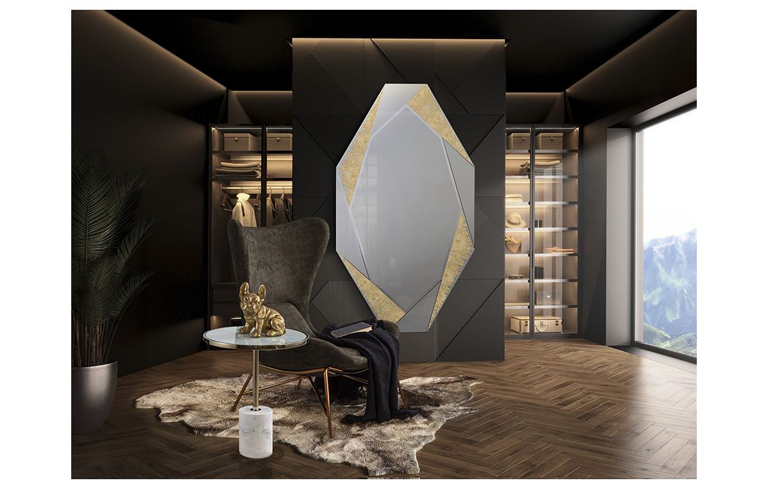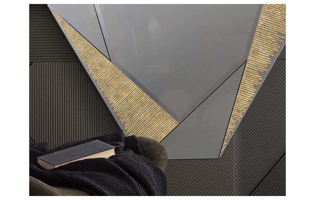 Mirror with beveled moons and gold leaf graphics. Black lacquered MDF back. Prepared to hang in a horizontal or vertical position.