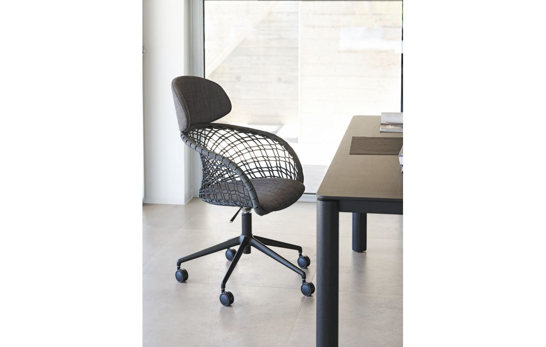 Height-adjustable swivel chair, metal base with wheels. Leather backrest and fabric upholstered seat.Recipient :