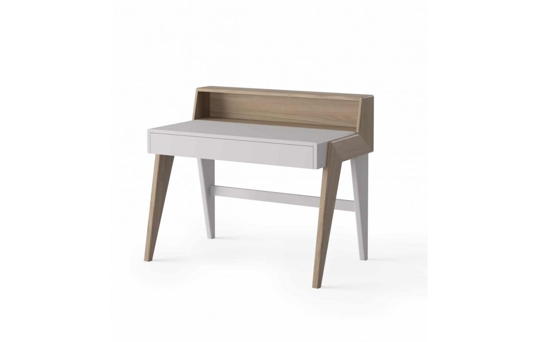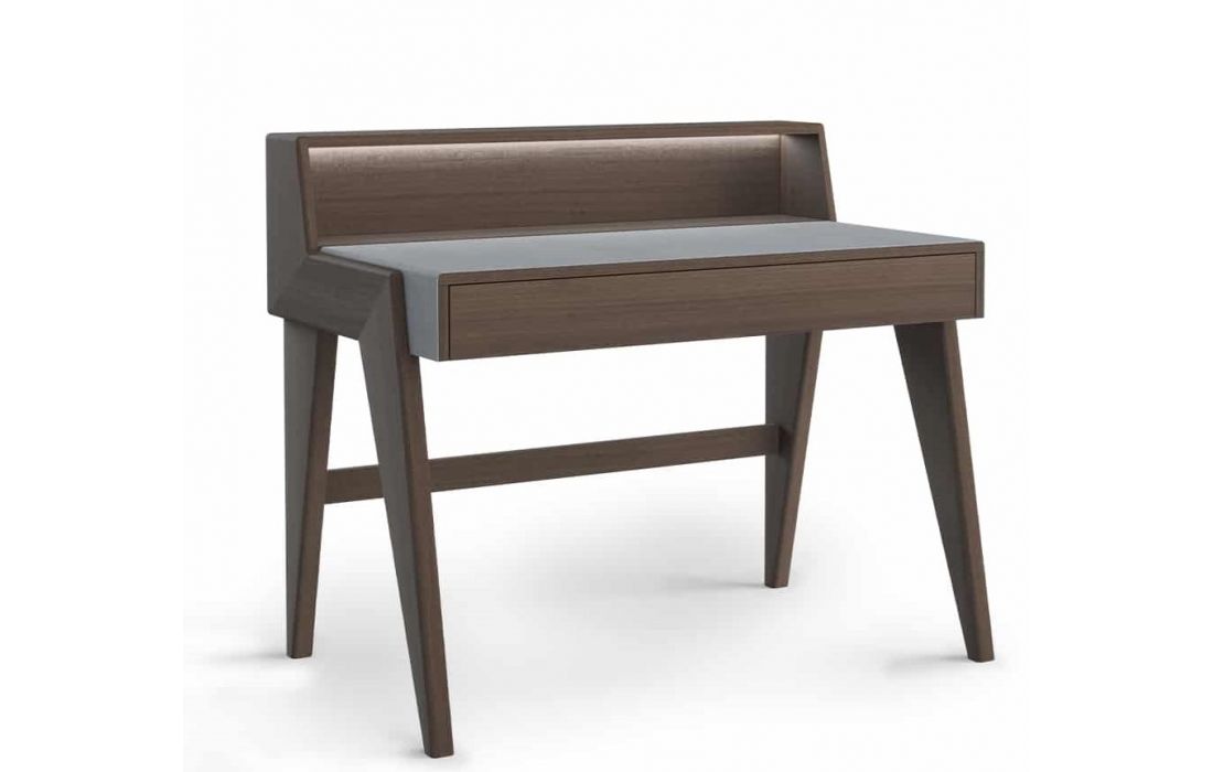 Multifunction desk in wood sheet combined with matt lacquered MDF and LED in the niche. Secret with lid to lift for access to electrical outlet and USB. Organizer drawer with interior dividers.Dimensions in cms