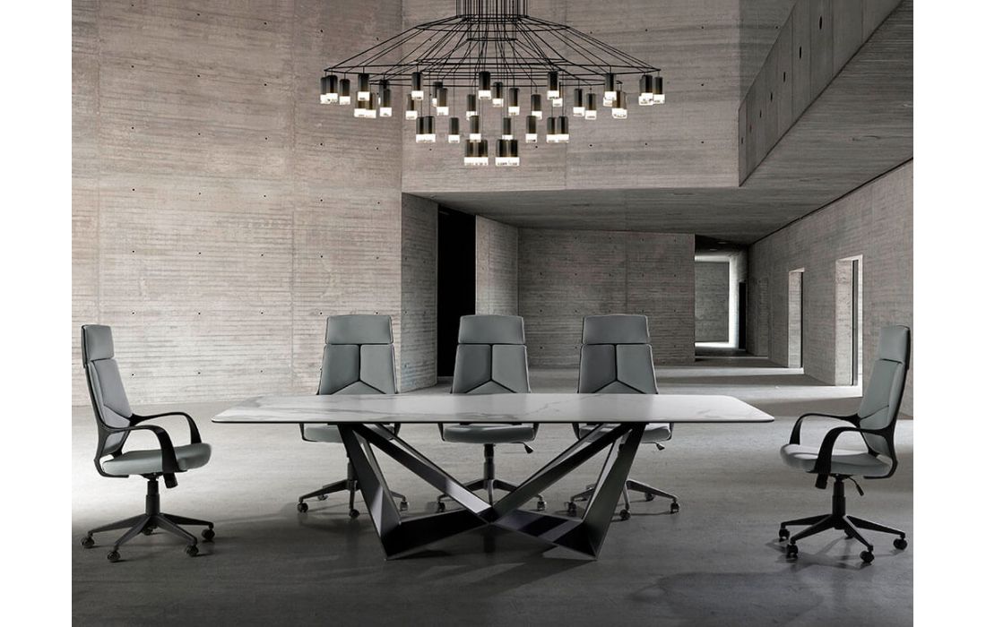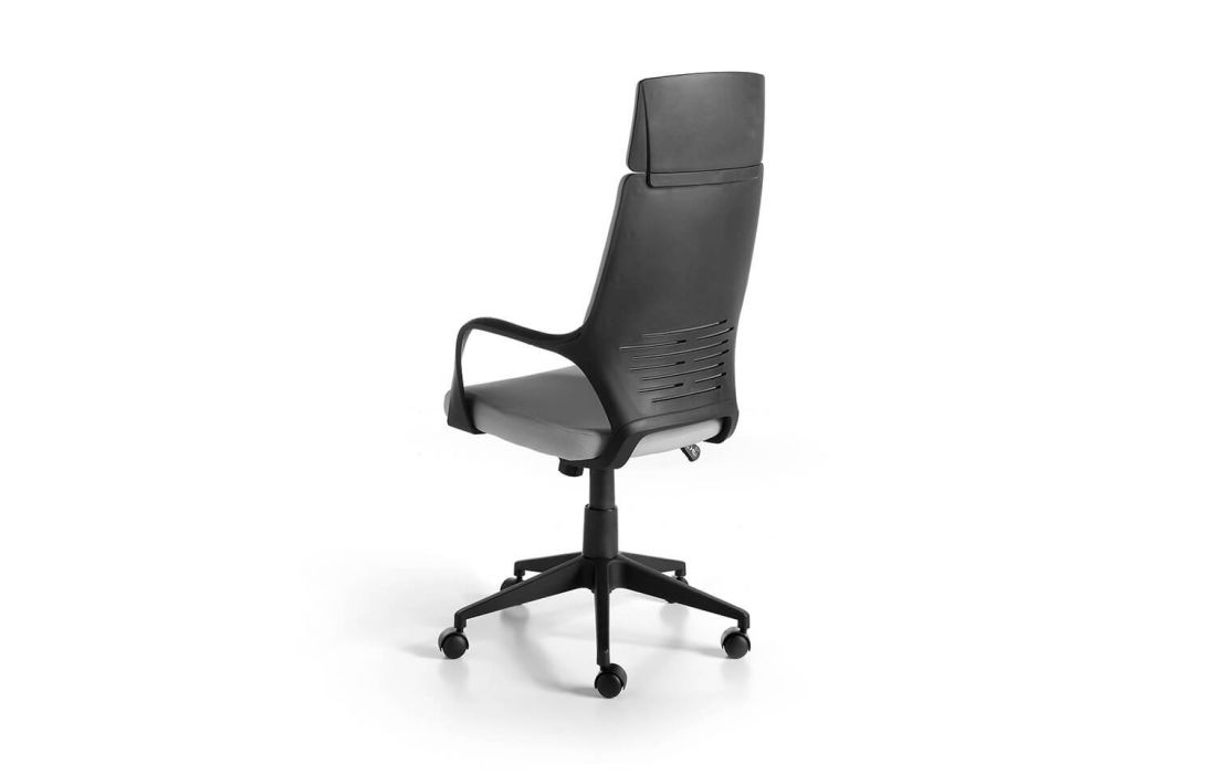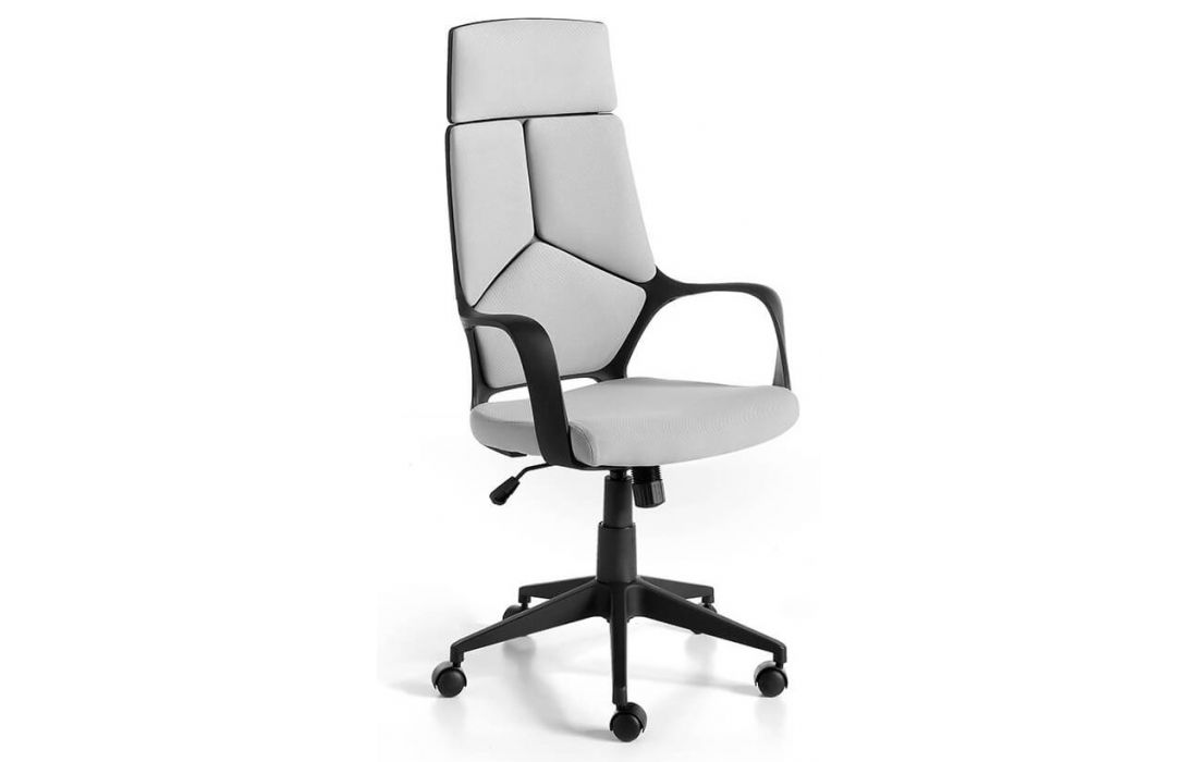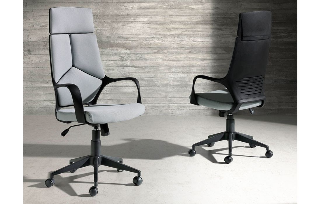 Office chair upholstered in gray fabric with armrests. 360º swivel system and reclining mechanism. Height adjustable by lever with hydraulic lifting mechanism. Black legs with wheels.