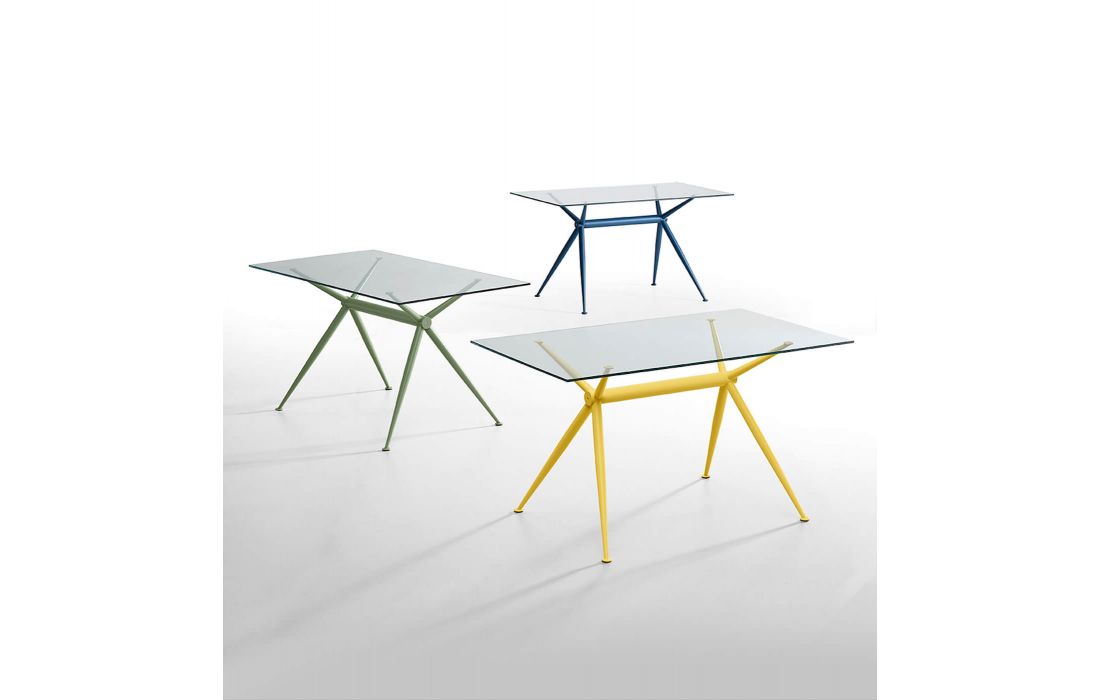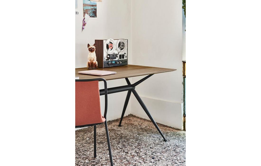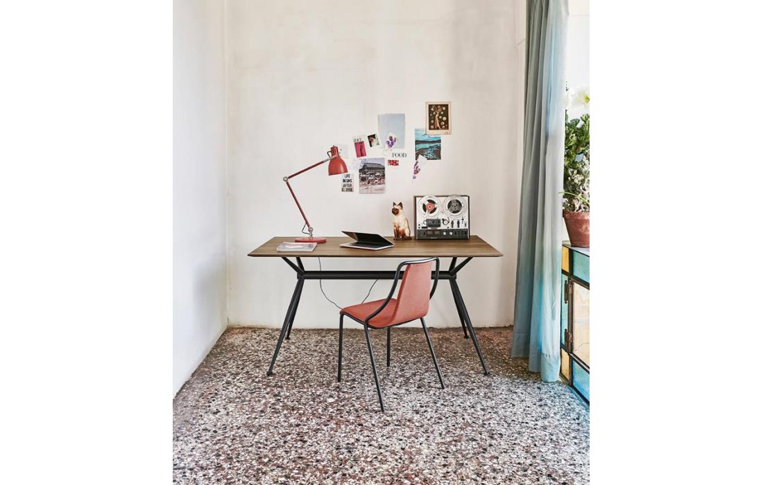 Work desk with structure in lacquered or chromed metal, with veneered wood top