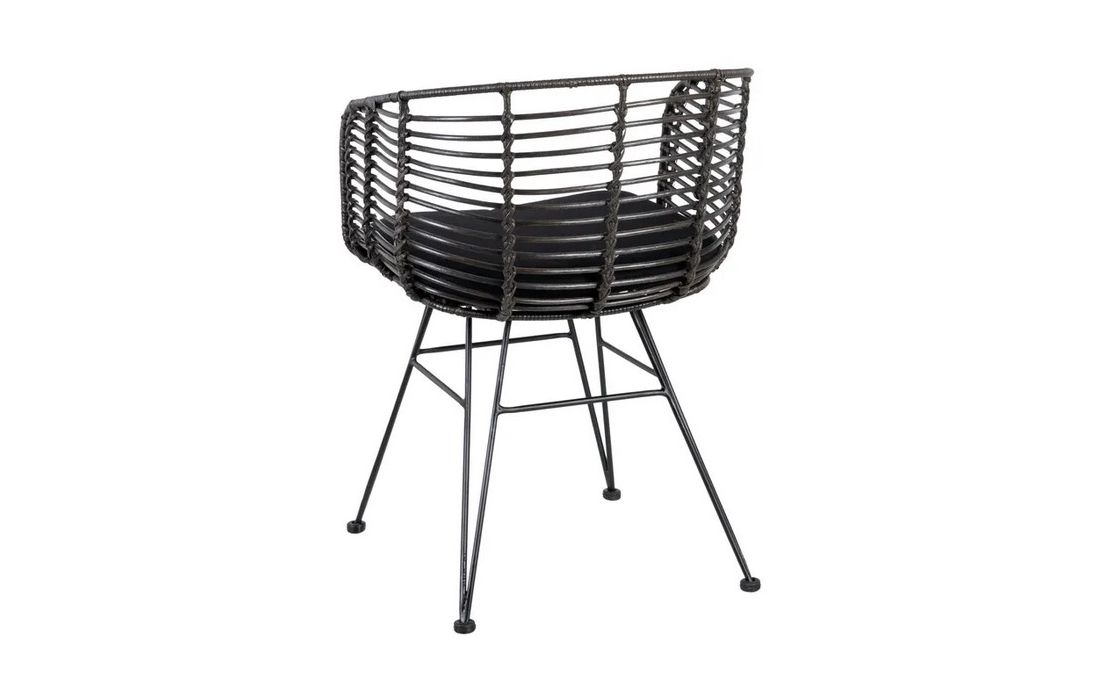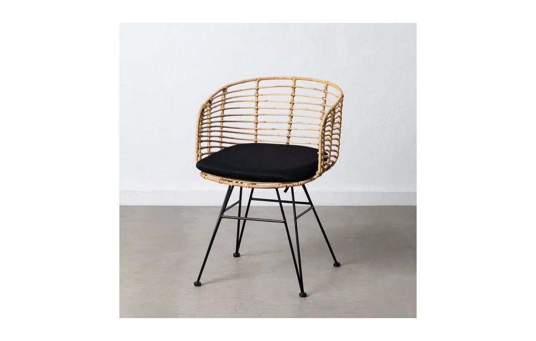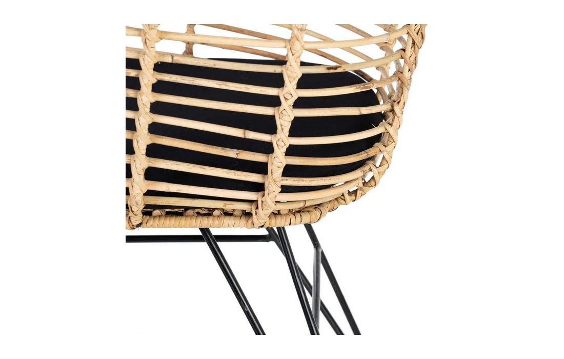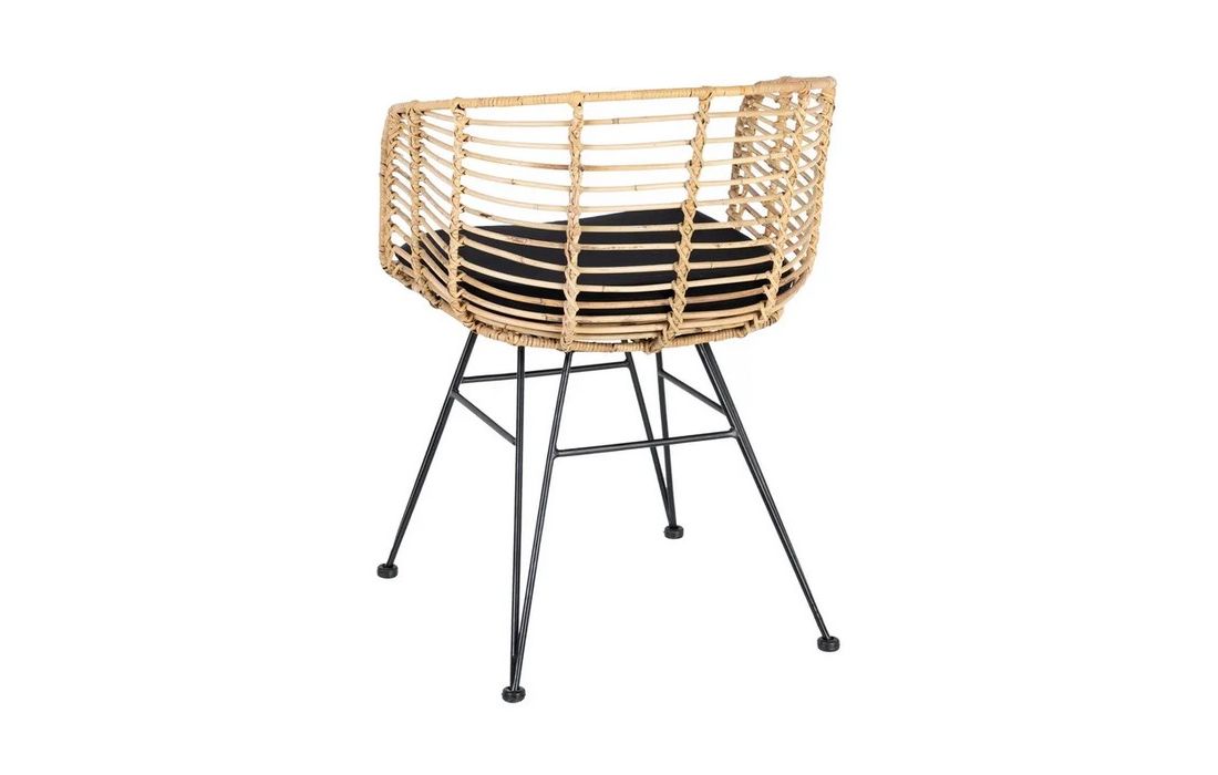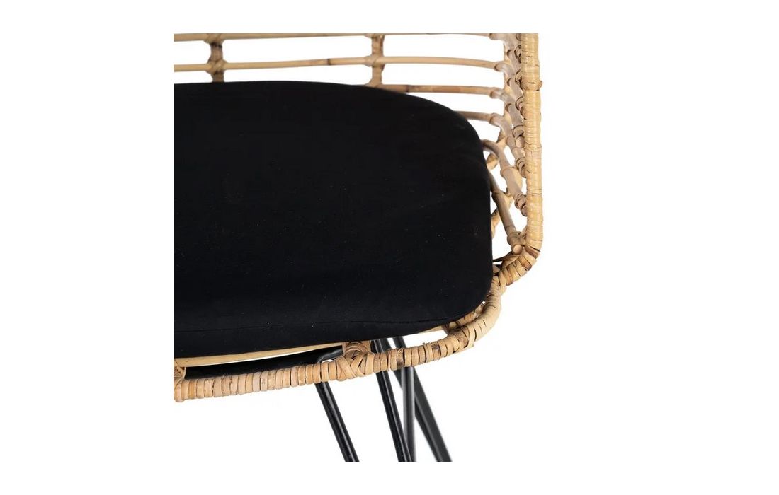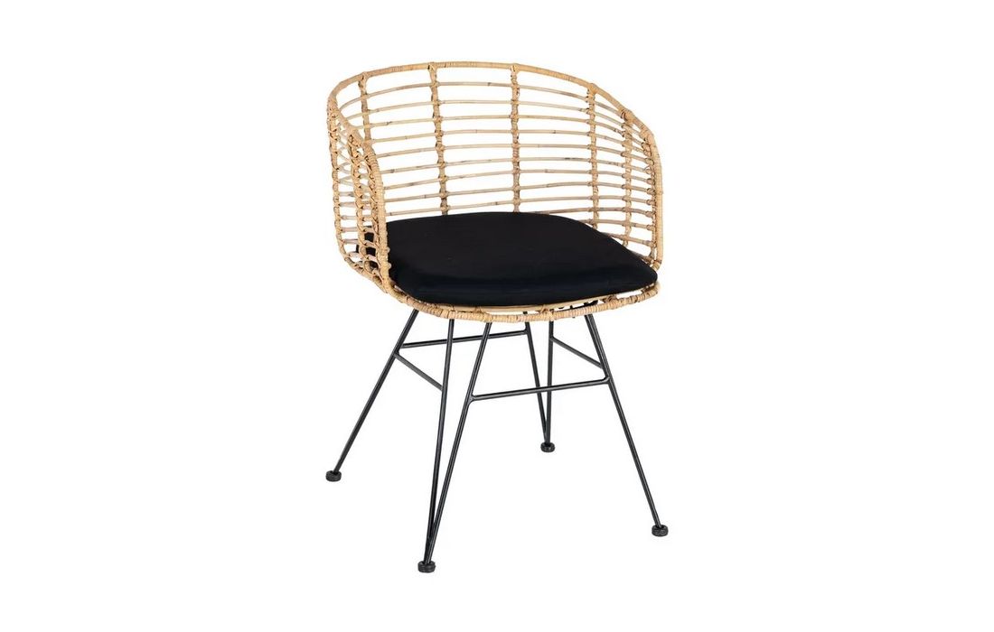 Chair in ratan with black metal legs. Removable 100% polyester cushion. Available in natural, brown and black.