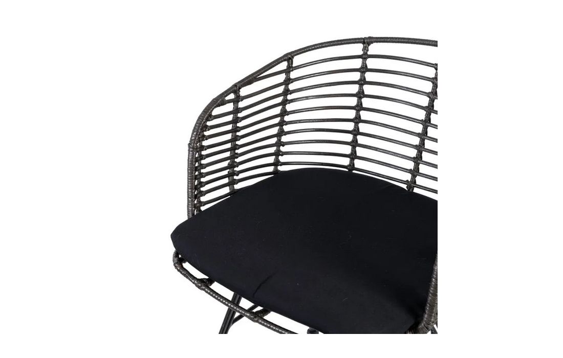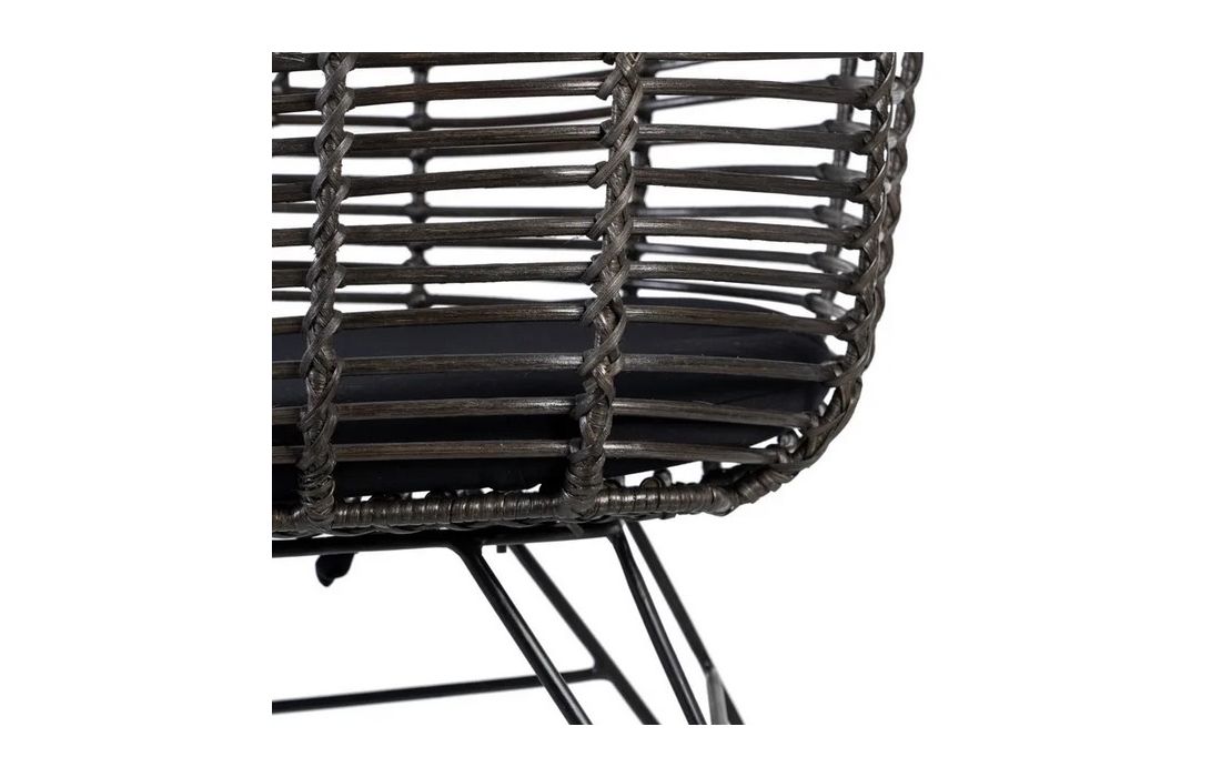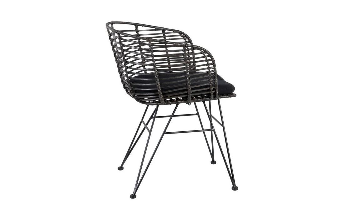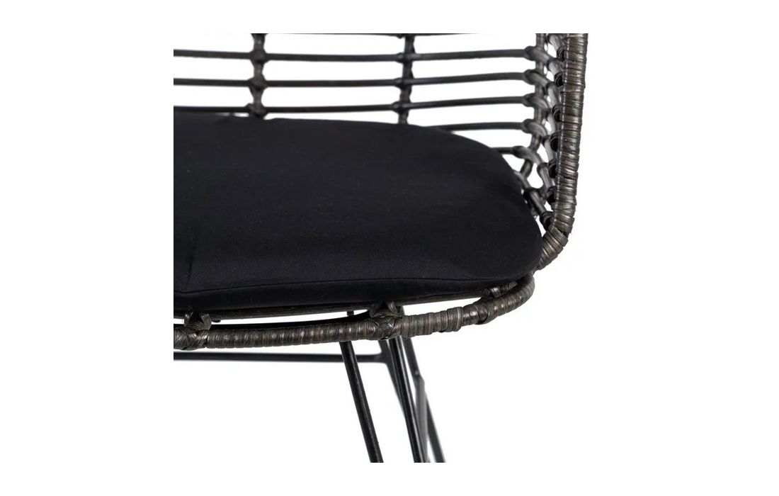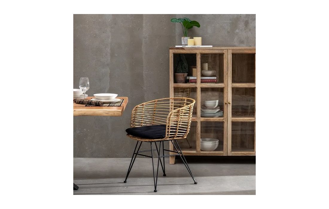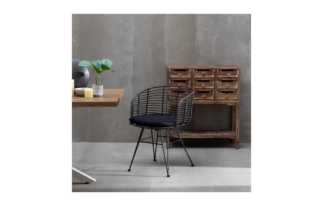Chair in ratan with black metal legs. Removable 100% polyester cushion. Available in natural, brown and black.