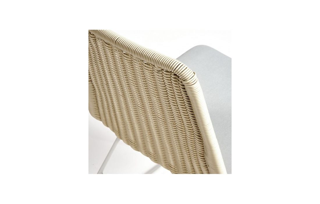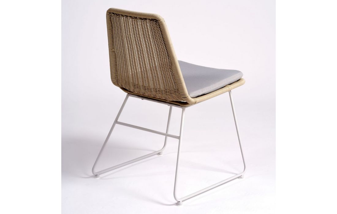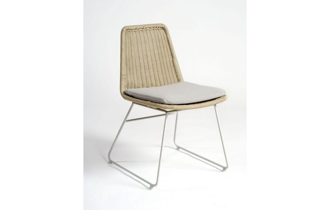 Synthetic rattan chair and metal leg structure.
