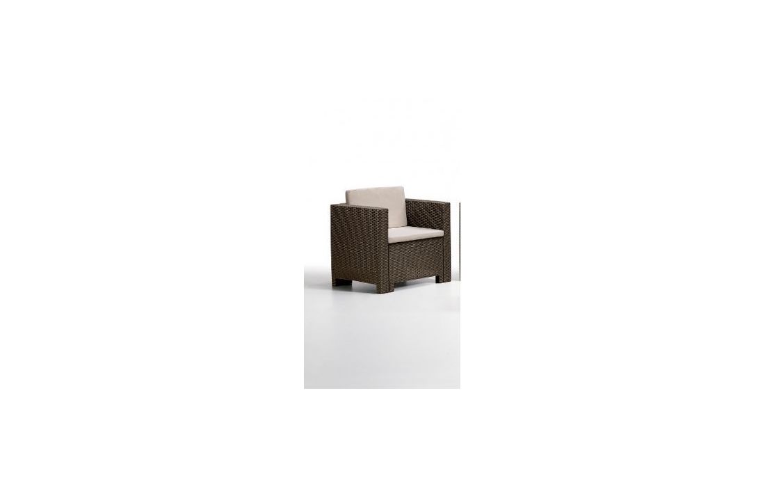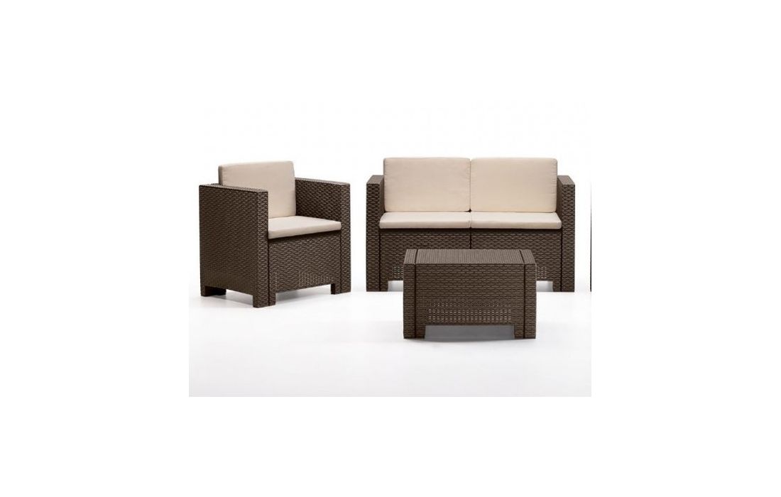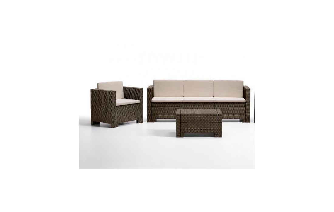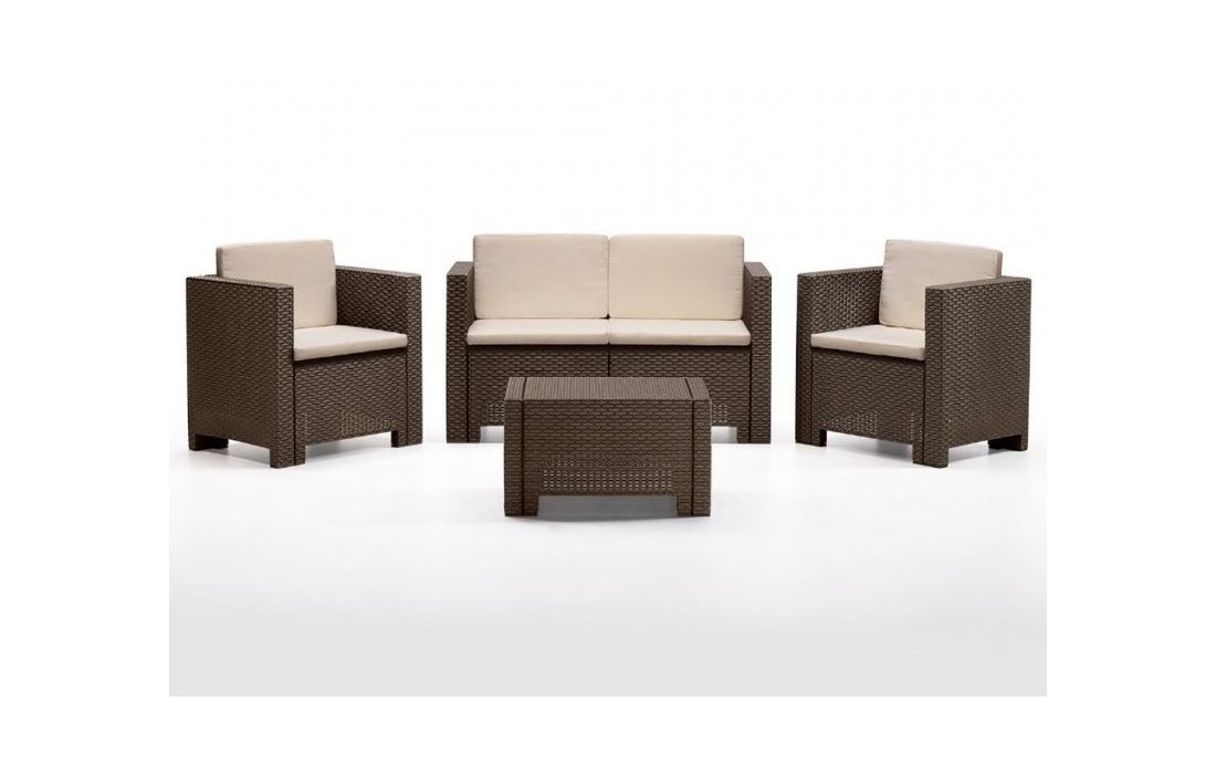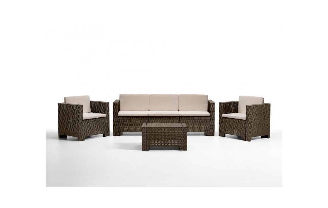 Outdoor set in brown synthetic rattan consisting of two armchairs, 1 3-seater or 2-seater sofa, coffee table and beige cushions.