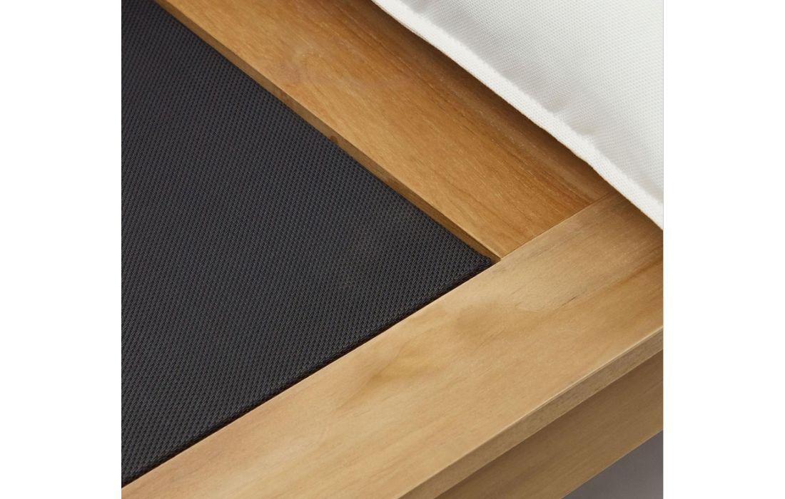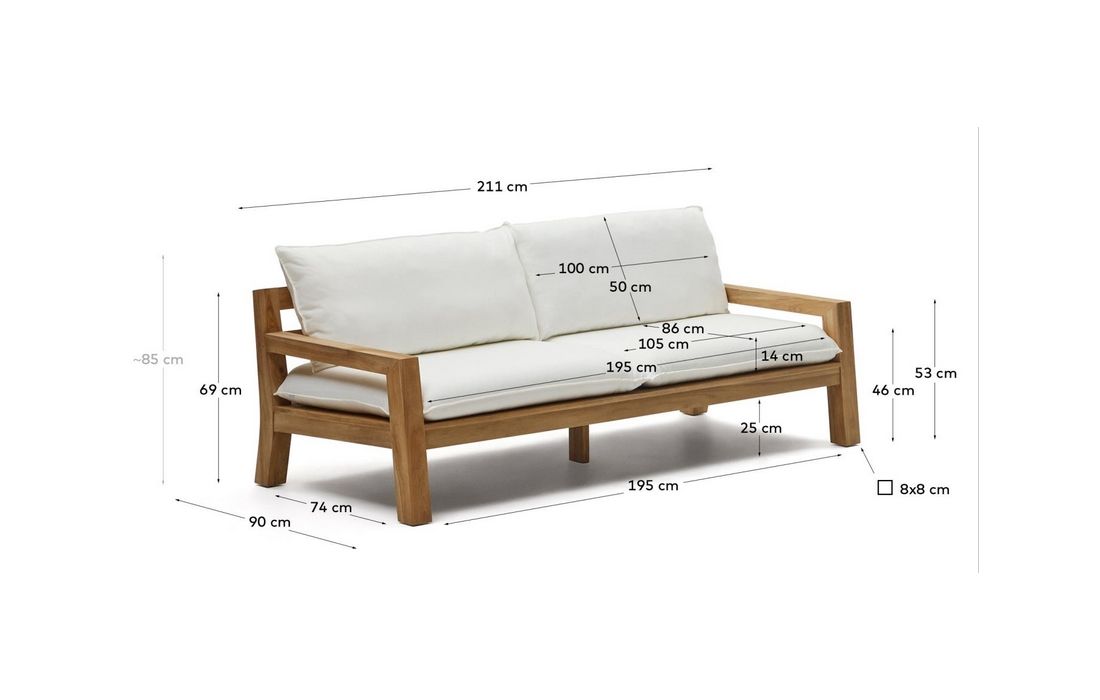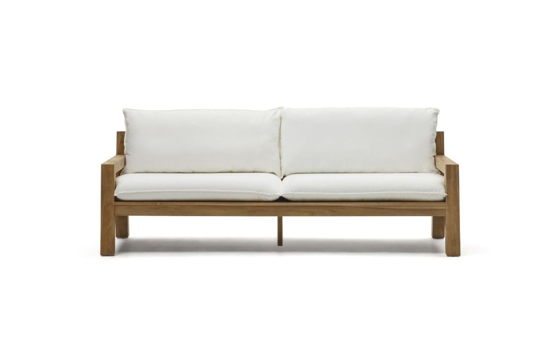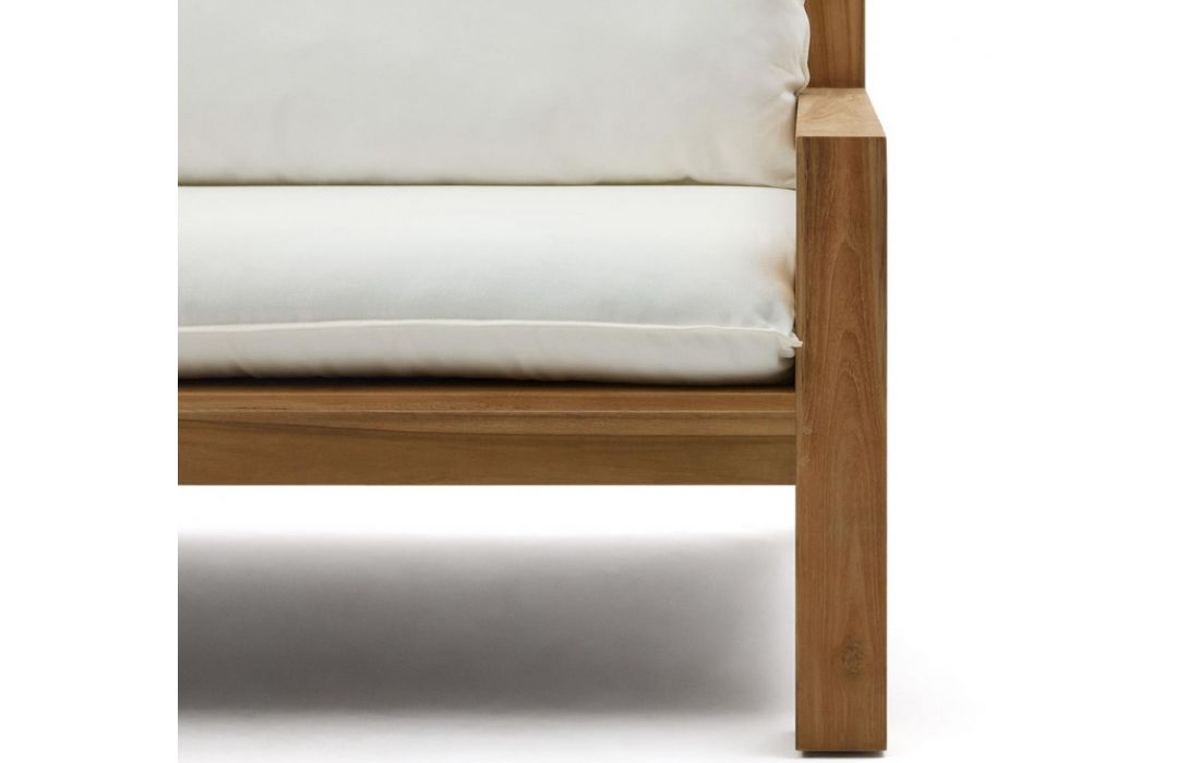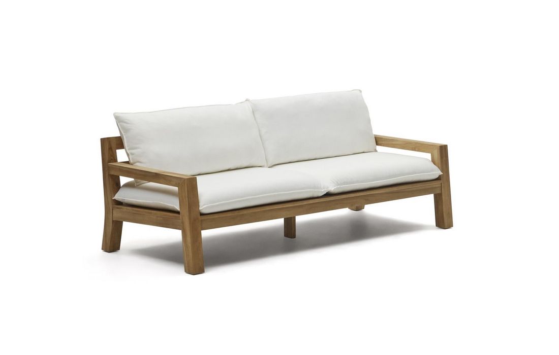 2 seater sofa with structure in teca wood, pillows included in beige